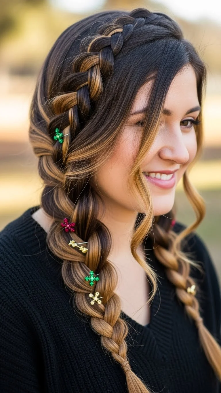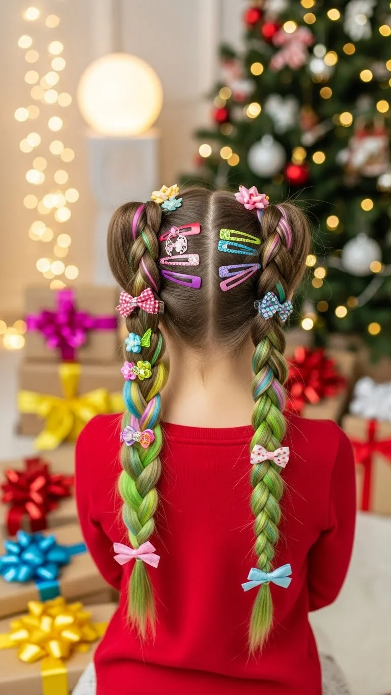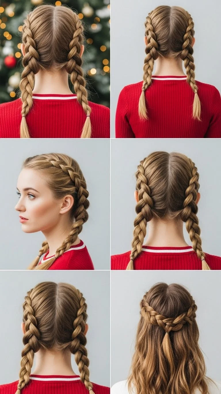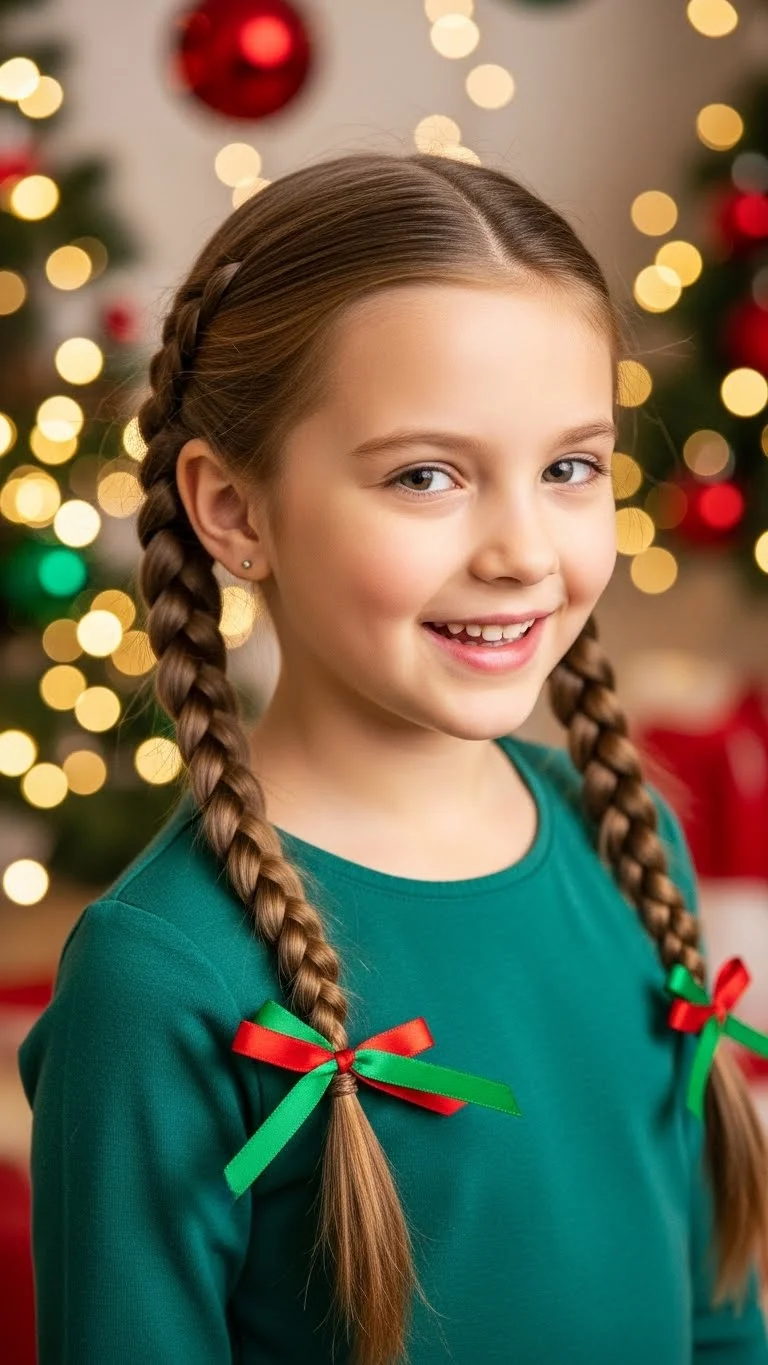 Basic braided pigtails are timeless and playful. Part your hair down the middle and create simple braids on each side. Secure with festive ribbons. This style is easy for all ages and brings a cheerful vibe. It’s a go-to for casual holiday outings!