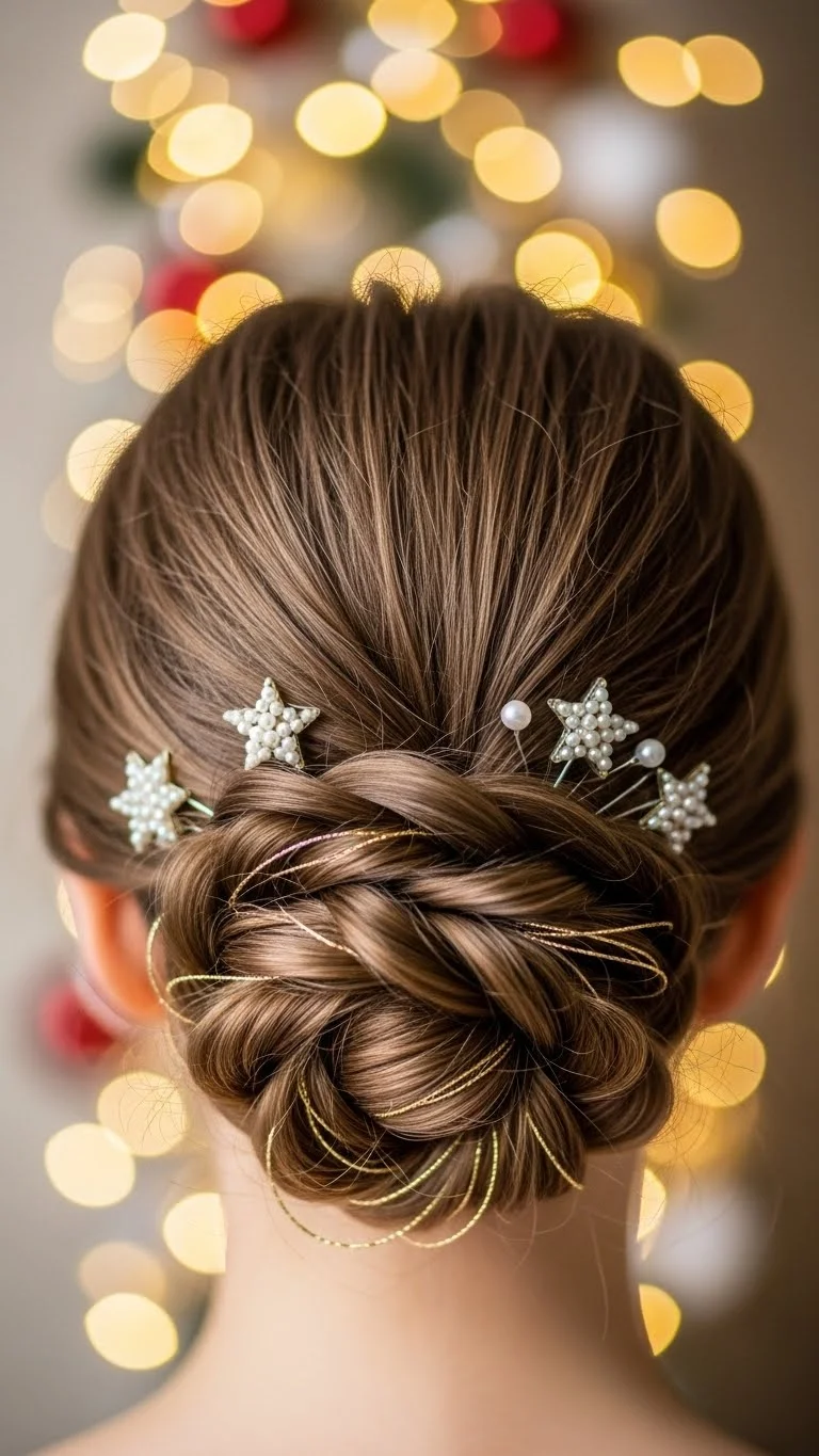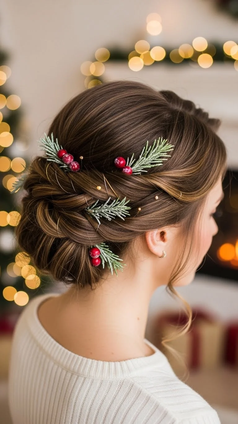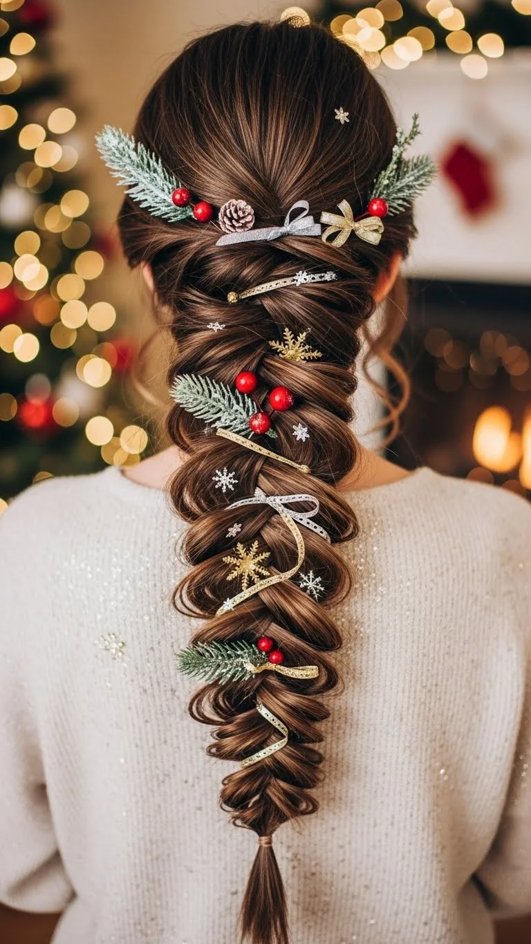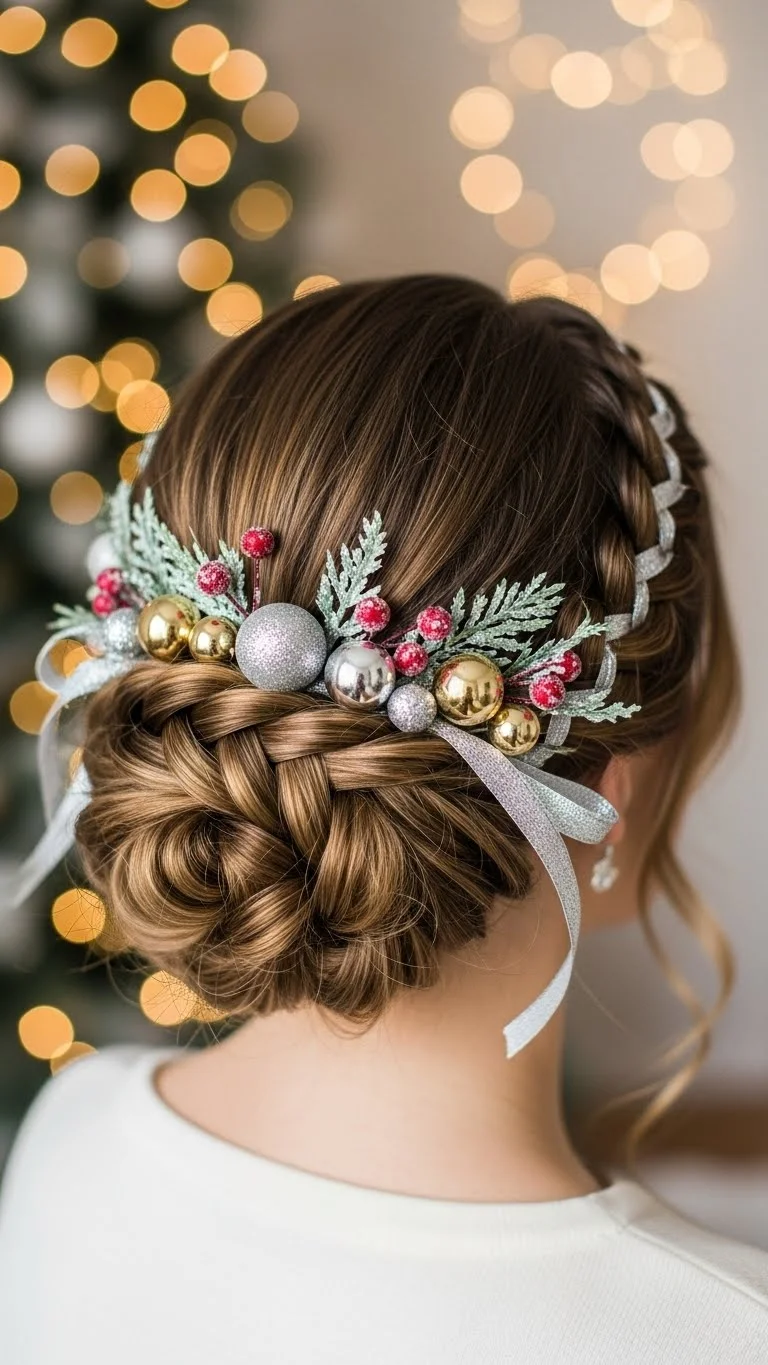 The twisted chignon braid offers elegance with a twist. Twist sections of hair into a chignon at the nape and braid them together. This style is perfect for formal gatherings and looks sophisticated. Enhance it with decorative hairpieces or tiny ornaments to match the holiday spirit. It’s a stunning option that’s easy to create!