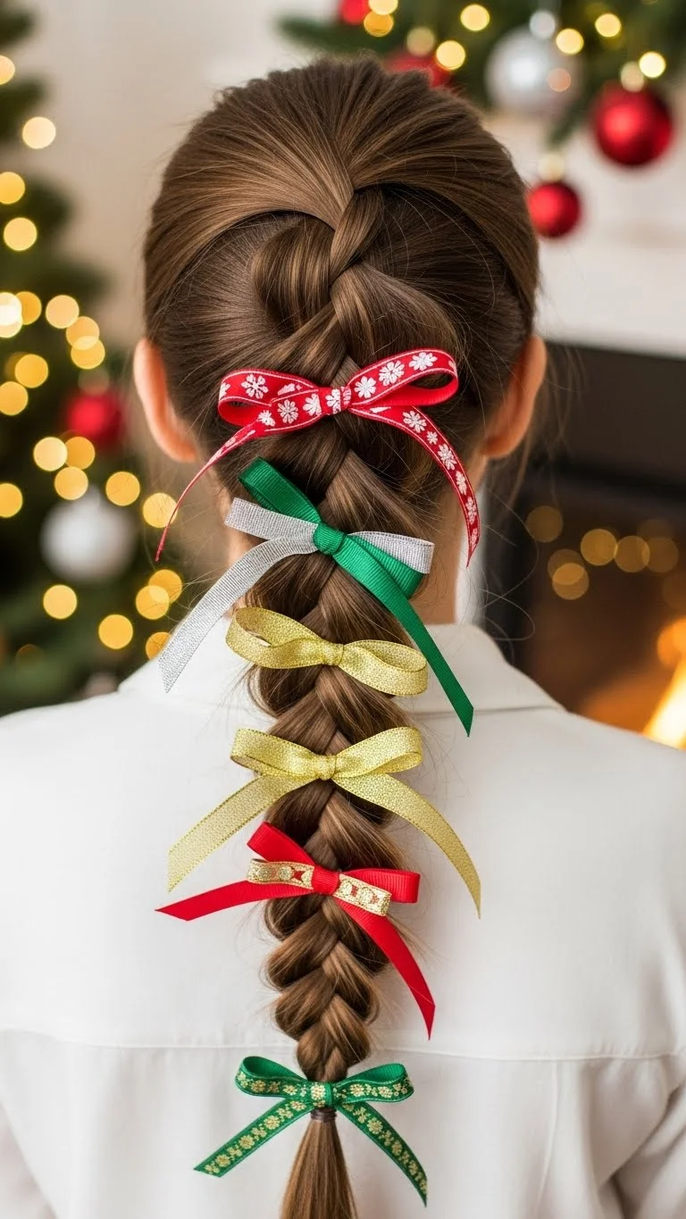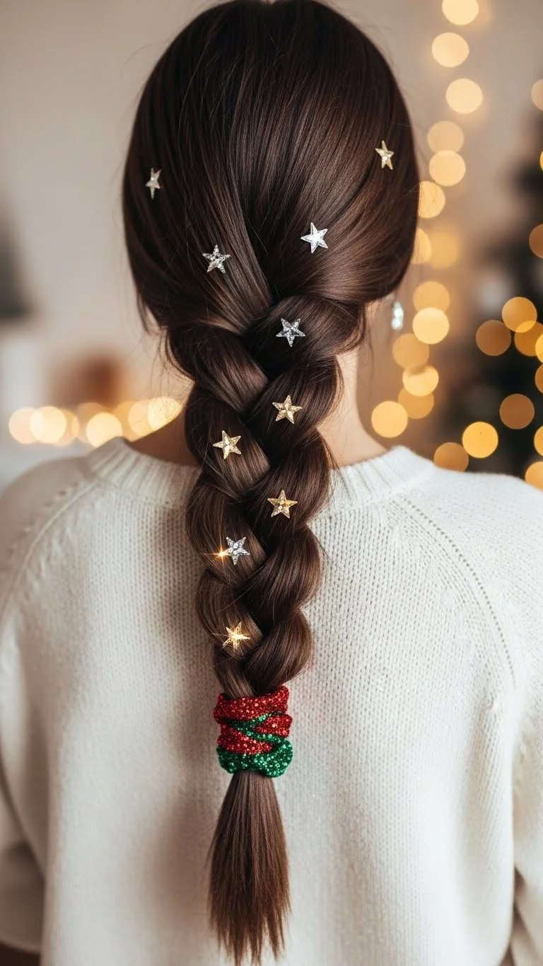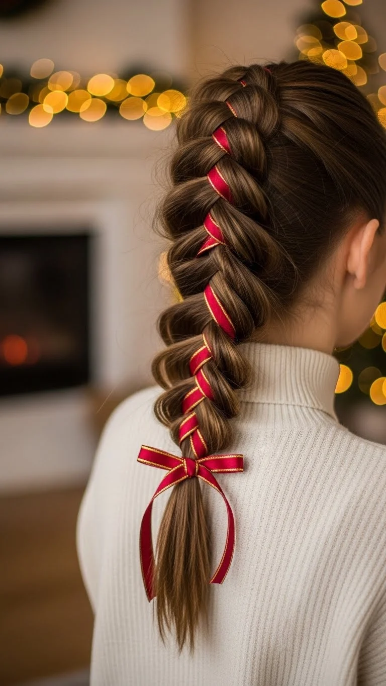 A braided ponytail combines simplicity with style. Pull your hair into a ponytail and braid it for a polished look. This style stays neat and works for both casual and formal events. Use a fun holiday ribbon to tie off the braid. This look is quick, cute, and helps you maintain a festive spirit!