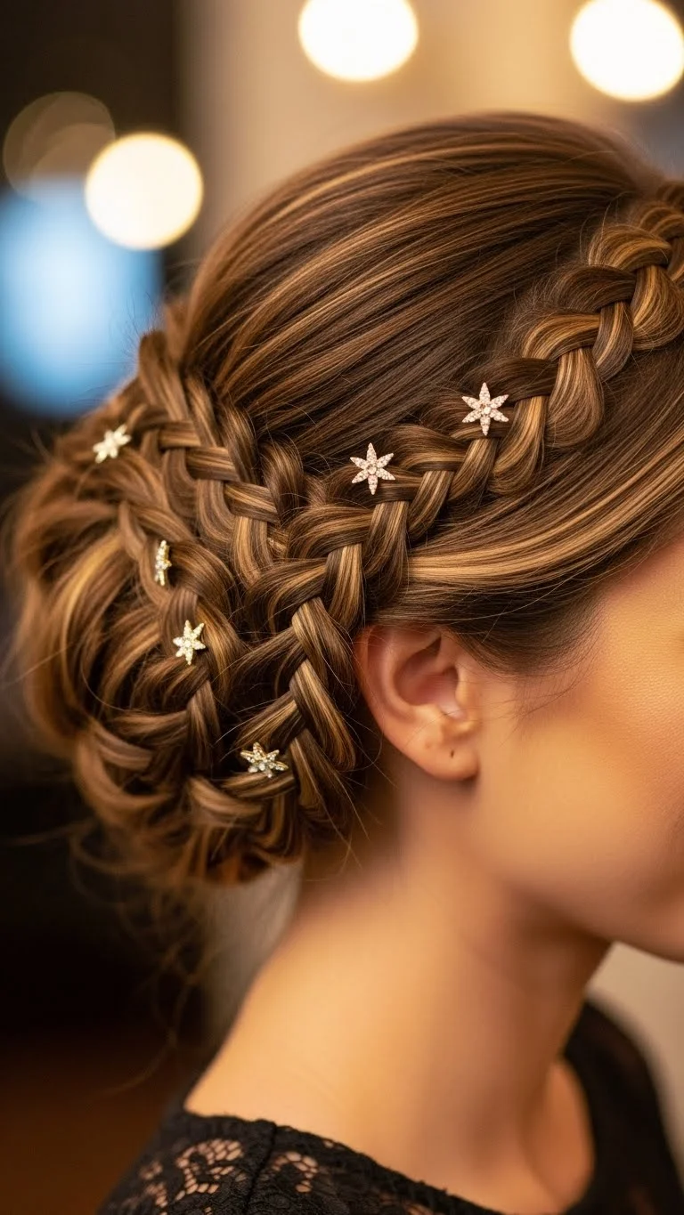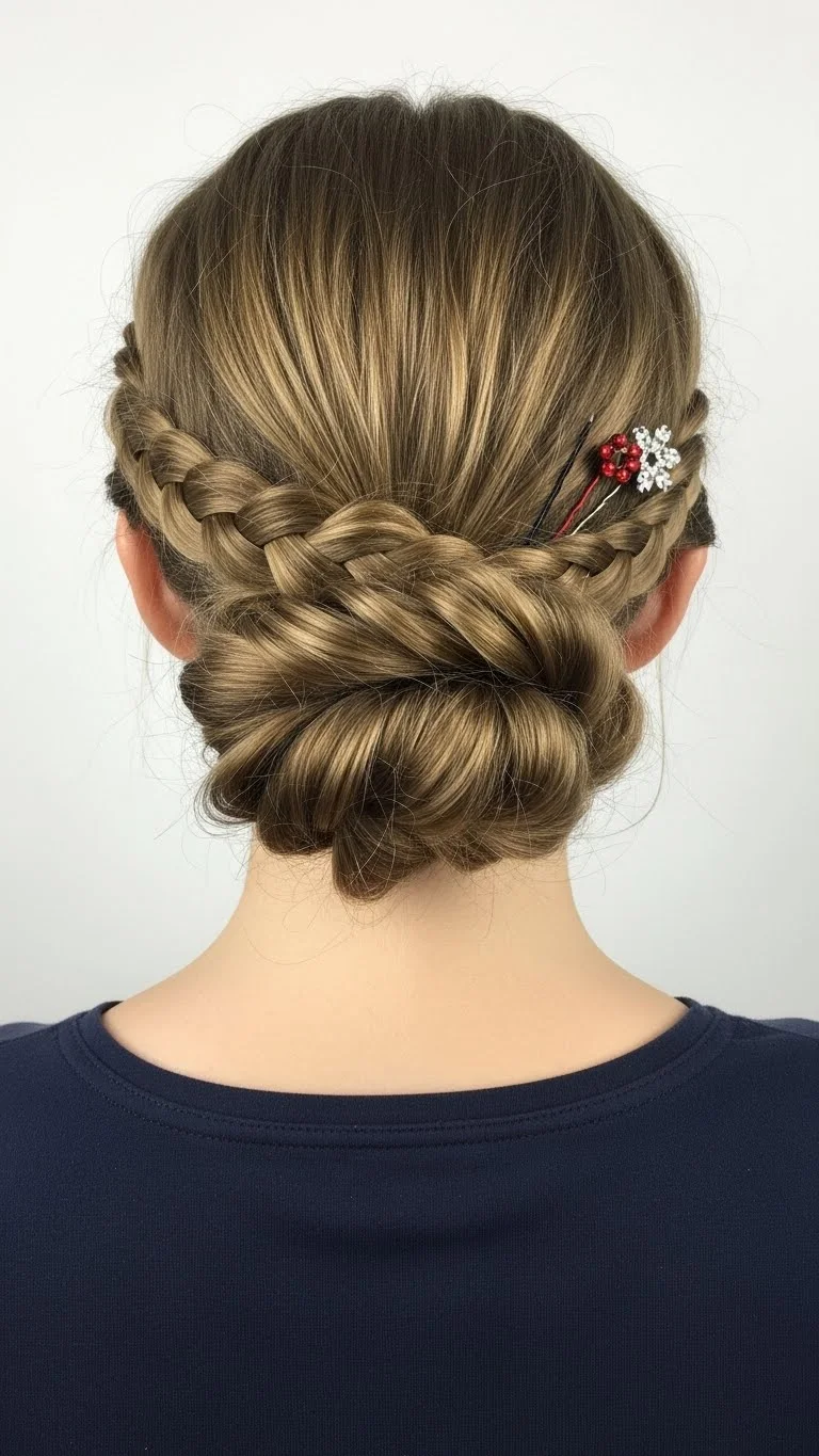 A braid-wrapped bun offers a classy, elevated look. Create a simple bun and wrap a braid around the base for added interest. Secure with bobby pins to finish. This style is perfect for formal events and looks polished with minimal effort. Add sparkles for a festive charm!