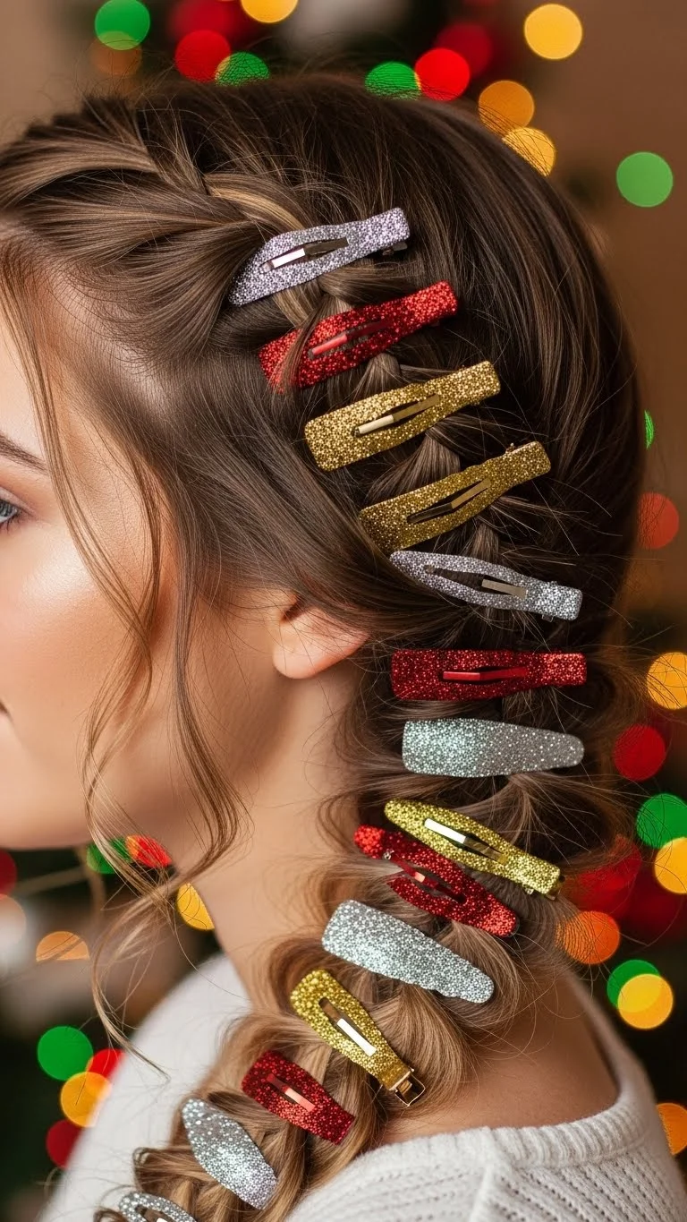 A side-swept braid offers an romantic flair. Braid your hair to one side and secure it with vibrant clips. This style is ideal for glitzy holiday parties. You can use colorful glitter clips to pop against the braid. It’s a simple DIY that brings sparkle!