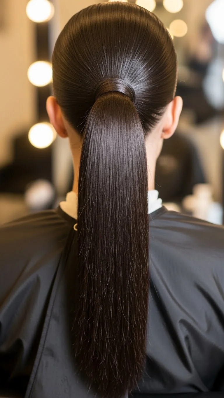 A sleek ponytail with a middle part looks clean and chic. Apply a tiny amount of smoothing cream to the top. Brush evenly and secure low or mid-height. For shine, run a straightener over the ponytail once. Wrap a strand around the base to hide the elastic. This style works for all lengths long enough for a ponytail. Add a metallic ribbon for holiday charm.