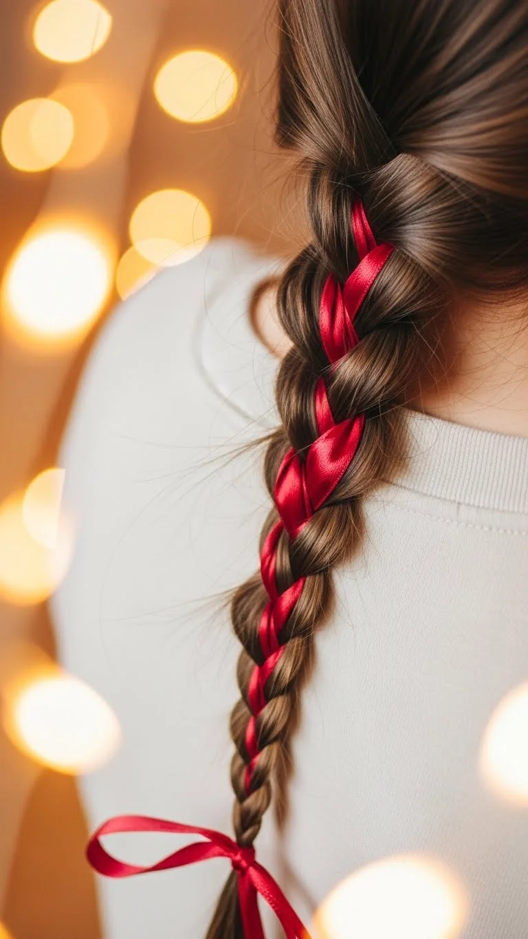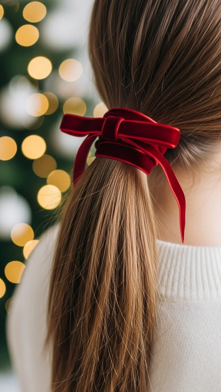 A low ponytail becomes festive with a ribbon wrapped around the base. Use a velvet or satin ribbon for a warm mood. Keep the ponytail smooth by brushing downward as you gather the hair. Tie the ribbon in a small bow or wrap it several times for a thicker band. If your hair is shorter, use a mini elastic and tie the ribbon around it. Add a light curl at the ends for shape. It looks polished but still simple to create.