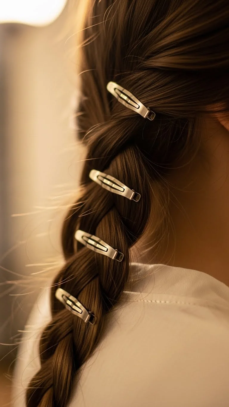 A simple side braid feels charming with tiny clips spaced along it. Start with a loose three-strand braid so it looks soft. Pull the braid outward a little to widen it. Add small metallic clips or mini holiday charms. Dollar stores carry plenty of cute options. Finish with a small elastic. Let small face-framing pieces stay out for a gentle touch.