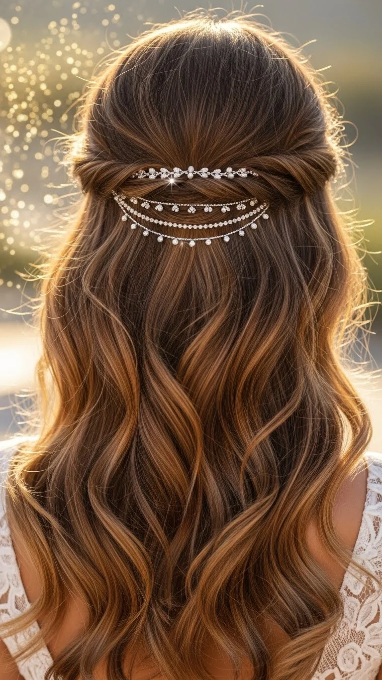 Hair chains add quick glamour. Place the chain across the crown and secure the ends under small sections of hair. Let loose waves fall naturally. Use a wide-barrel curler for a soft shape. This works even if your waves aren’t perfectly even. Choose a gold or silver chain depending on your outfit. It’s an affordable accessory that instantly looks special.