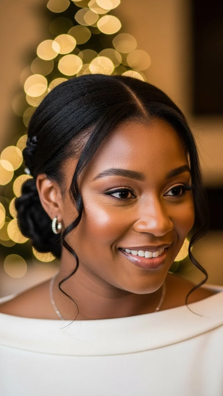 A rolled chignon sits neatly at the base of the neck and feels perfect for formal holiday gatherings. Smooth hair into a low ponytail. Roll it upward into a tucked shape and pin it securely. Use gel lightly at the roots. If you want fullness, add a small pack of braiding hair inside the roll. A pearl pin placed at the center makes the style feel festive. This is a great style for photos because it stays tidy.