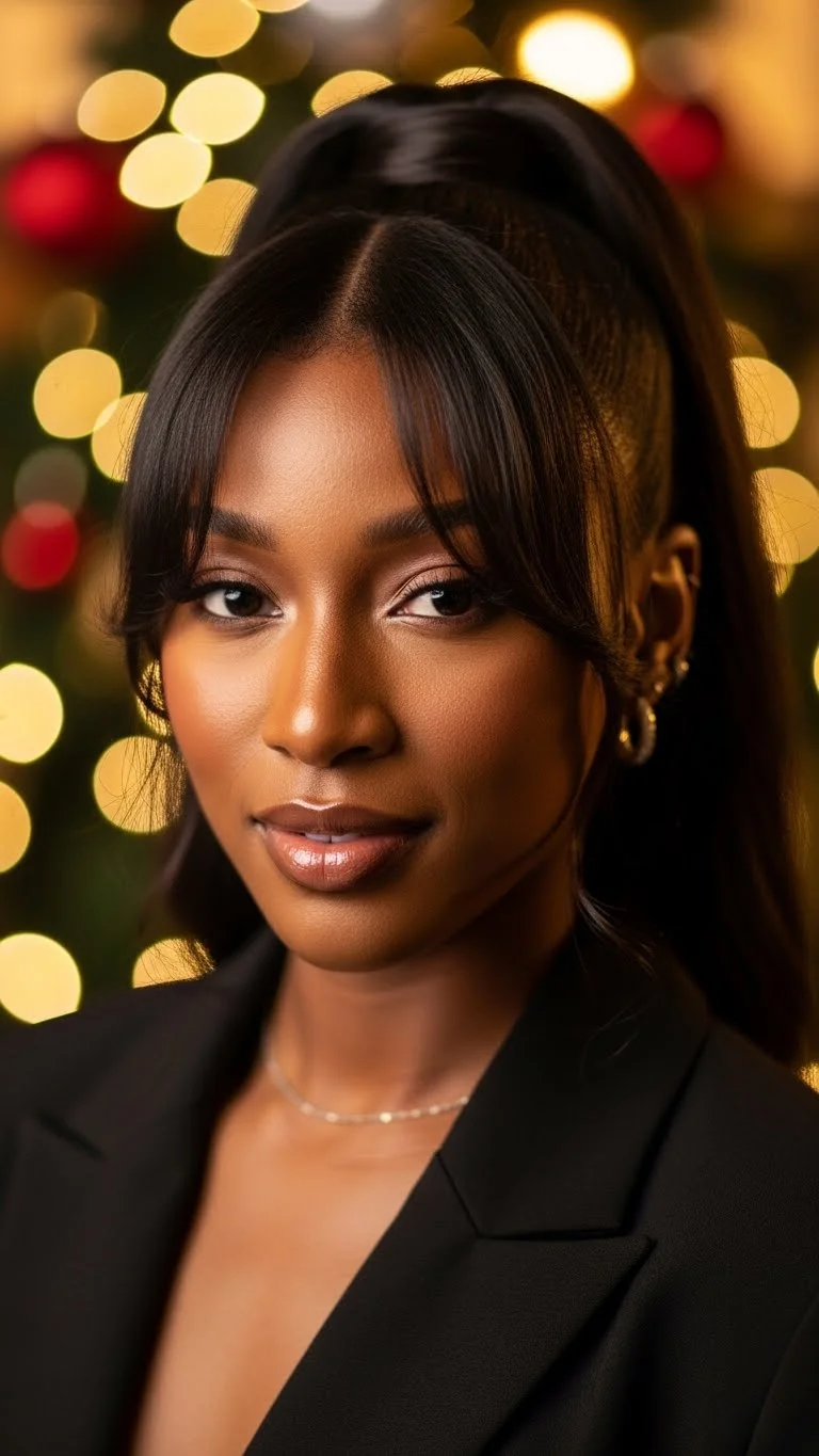 If you want bangs without cutting your hair, try clip-in fringe. Smooth your natural hair into a bun or ponytail. Attach the bangs and adjust them to your liking. Add a faux ponytail extension for length. Light oil on the bangs helps them lay flat. Choose bangs that curve slightly at the ends for a soft look. Add a decorative clip near the crown for holiday flair. This style is simple and changes your whole vibe instantly.