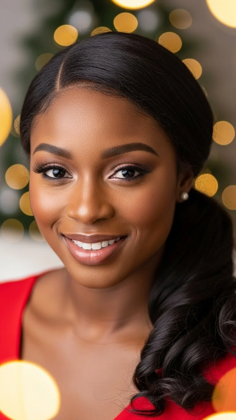A twisted ponytail gives a soft, elegant shape. After smoothing hair into a low ponytail, divide it in two and twist the sections together. Pin the ends neatly. Light oil helps maintain sheen. If you want fullness, use a small bundle of extensions twisted in with your hair. A delicate clip above the ponytail adds holiday charm. This style is simple and budget-friendly, especially if you already have twisting hair at home.