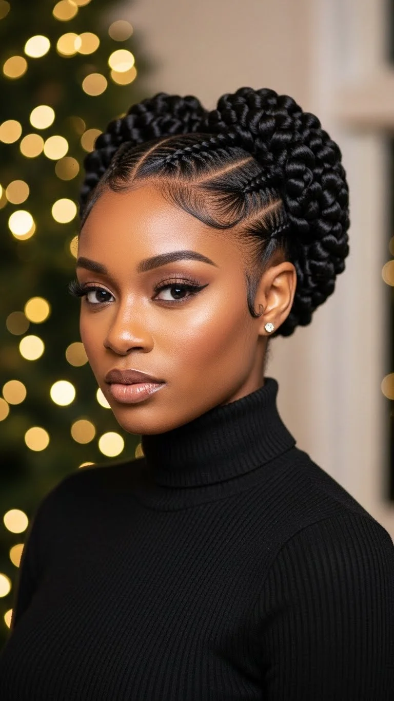 This style adds detail without being too bold. Smooth the hair into a top knot. Braid a small section from the back and wrap it around the base. Secure with pins. A little oil keeps the braids shiny. You can add more small braids if you want texture. A holiday pin at the back adds subtle sparkle. This style is easy and works well with cozy sweaters or formal dresses.