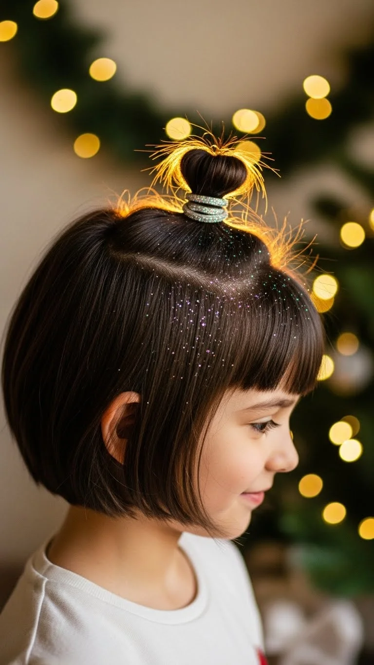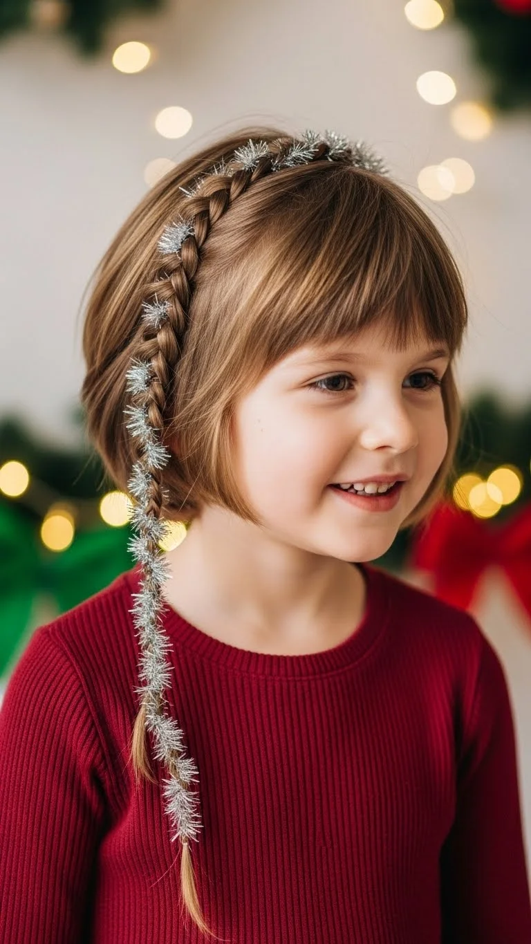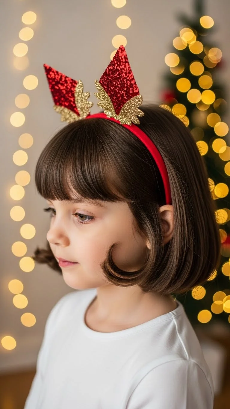 A sparkly headband bob is a quick and festive way to style short hair. Simply place a glittery headband over the hair and let the natural bob shine. For added flair, curl the ends slightly with a small curling iron. This style takes under five minutes and works great for school parties or family photos. Budget tip: Use affordable craft headbands or DIY by adding glitter to plain ones. Kids can even help decorate their own, making it a fun holiday activity.