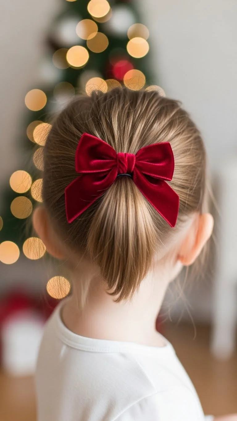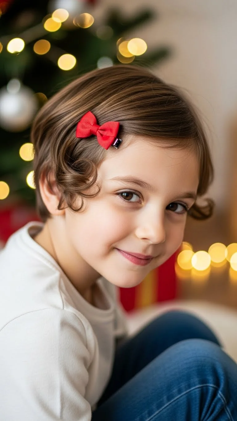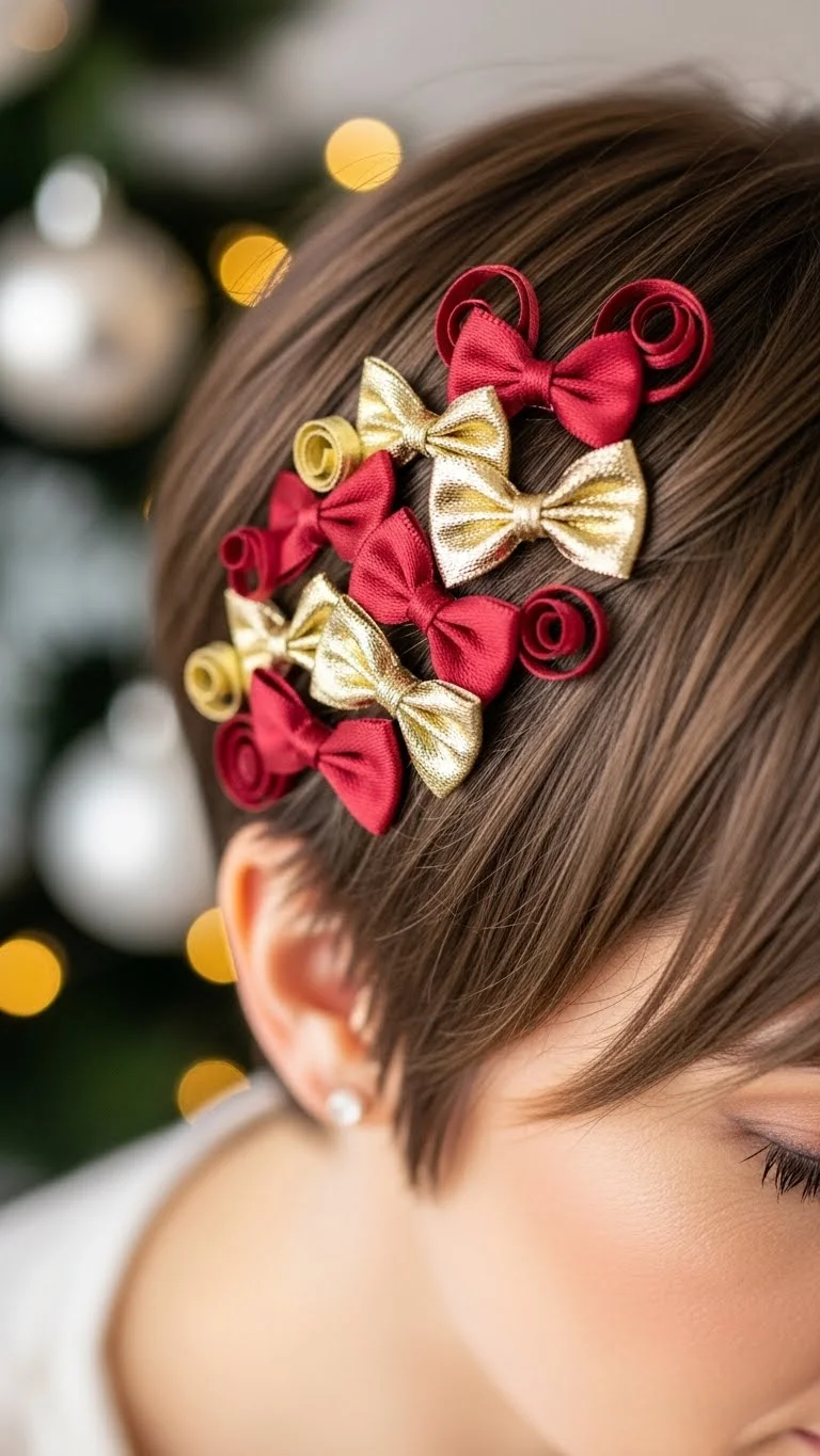 Finish with a bow cluster on a pixie cut. Place 2–3 small bows together for maximum impact. Quick, festive, and perfect for photos. Budget tip: Use small craft bows or repurpose old clips for a low-cost, cute style.