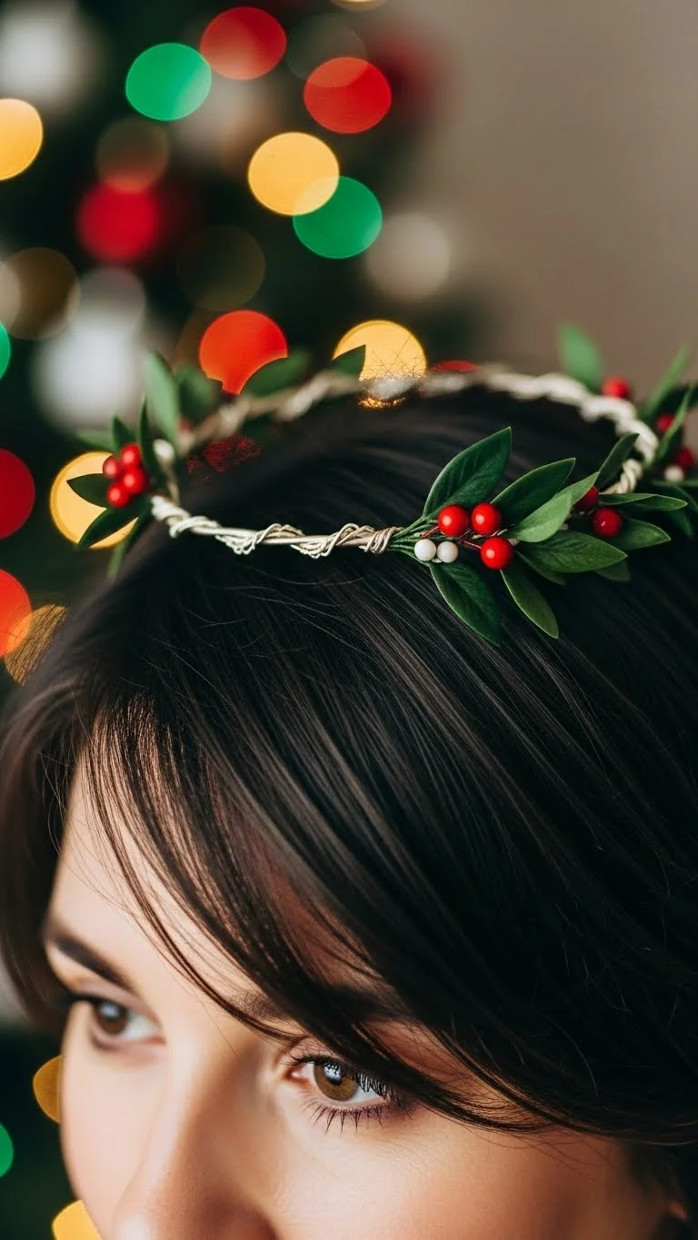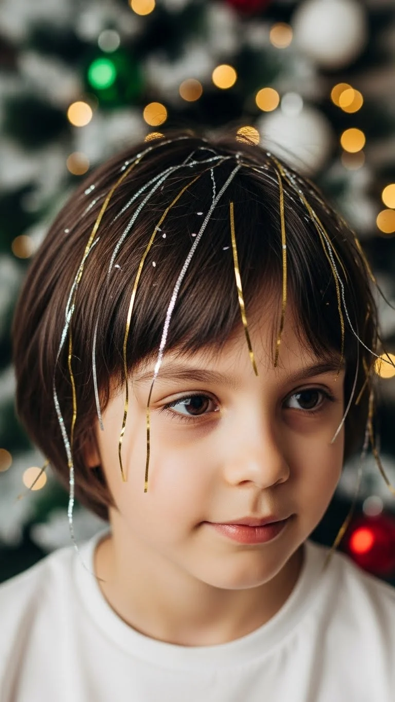 Weave a few strands of tinsel into short hair for a sparkly effect. Place near the front or crown to catch the light. This works with layered bobs or pixie cuts. DIY tip: Use craft tinsel cut into small sections and secure with tiny clips for safe, festive sparkle.
