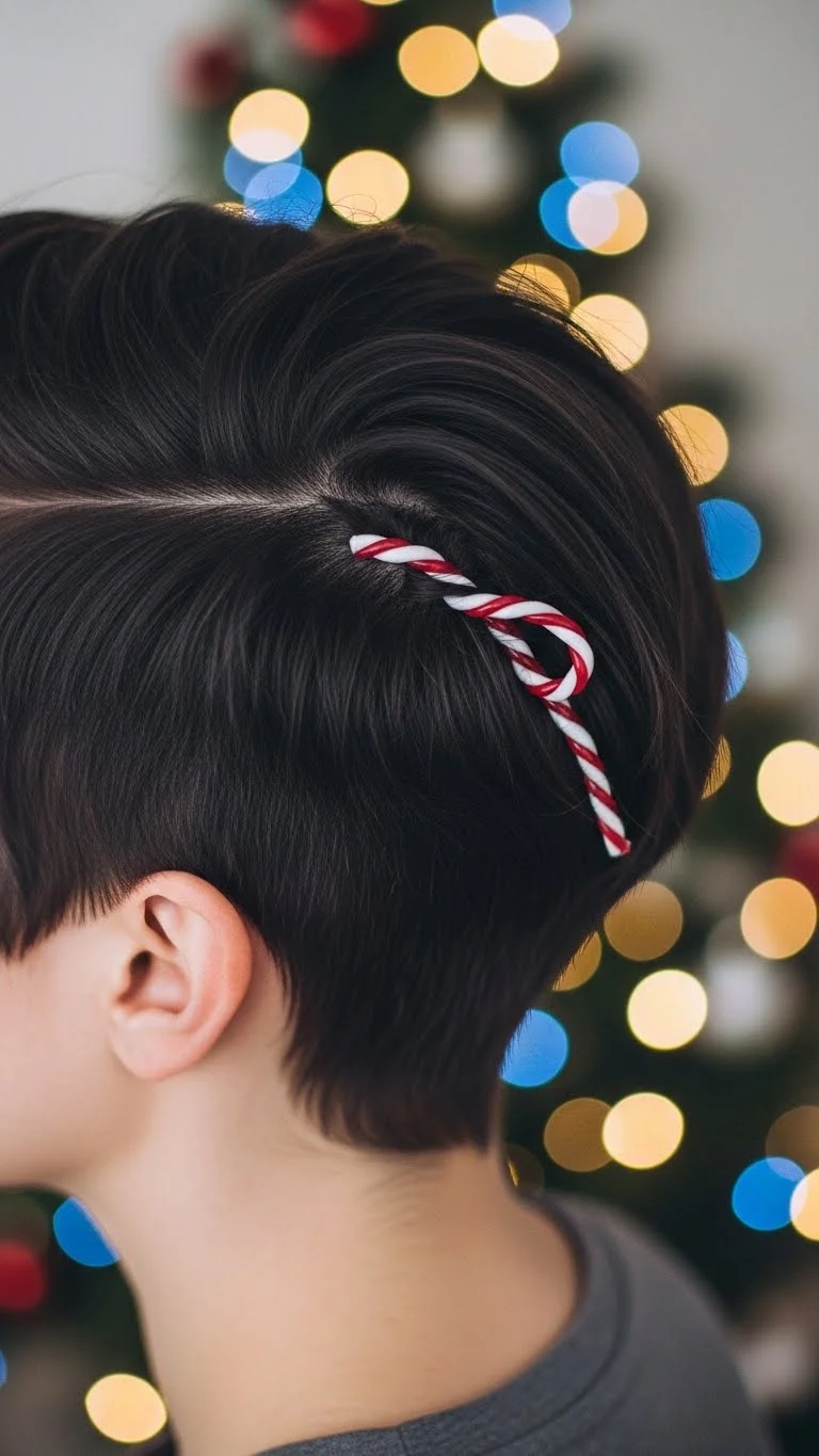 Create a candy cane twist by twisting a front section of hair and wrapping with thin red-and-white ribbon. Works on short bobs or pixies. Simple, playful, and holiday-ready. DIY tip: Use ribbon scraps to mimic the candy cane effect.