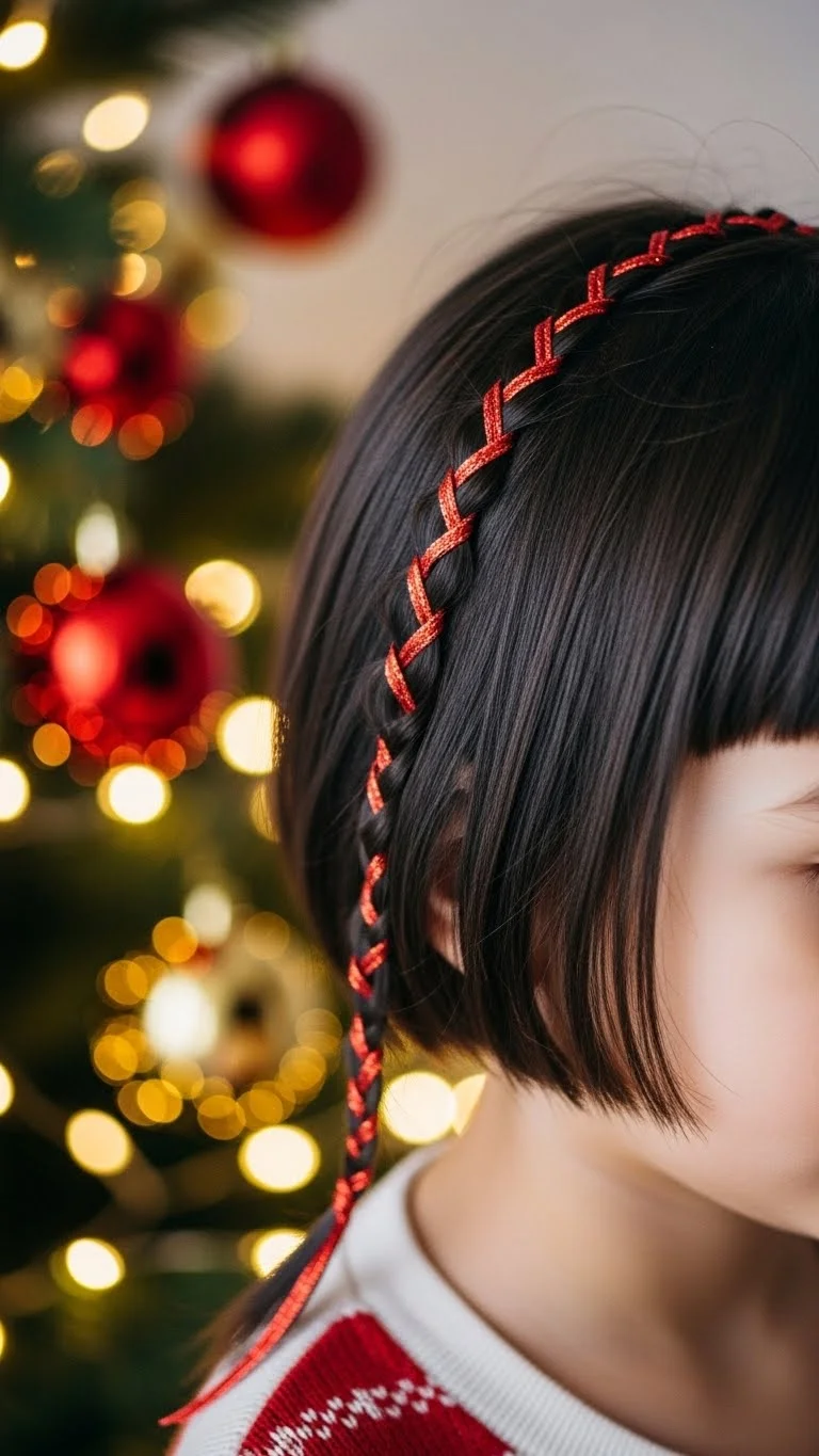 Weave a ribbon through a small braid for a festive accent. Works on side sections of short hair. Easy to do, kid-friendly, and visually appealing. Budget tip: Use ribbons from holiday wrapping for a cheap and fun style.