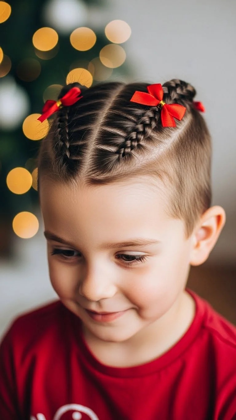 Mini pigtails are playful and easy to achieve on short hair. Divide hair into two sections and secure with small elastics near the ears. Tie festive ribbons around each elastic for holiday cheer. This style is comfortable for active kids and stays in place throughout the day. Budget tip: Use leftover ribbon scraps or inexpensive hair ties. Mini pigtails are perfect for casual gatherings or crafting holiday cards with kids.