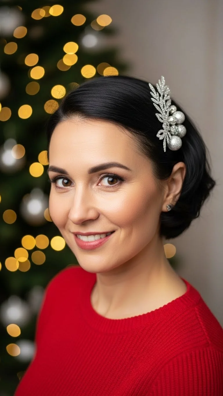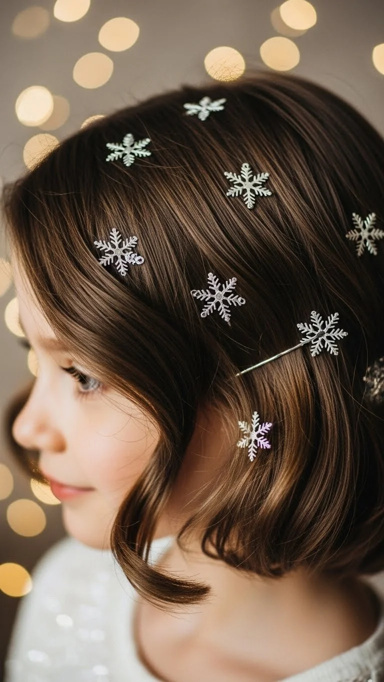 Snowflake hairpins instantly make short hair festive. Simply place a few decorative pins randomly across the hair. This style works for pixies or short bobs. It’s effortless, keeps hair tidy, and adds a holiday sparkle. Budget tip: Buy a set of decorative pins and reuse them each year. Kids can even help place the pins, making styling interactive and fun.