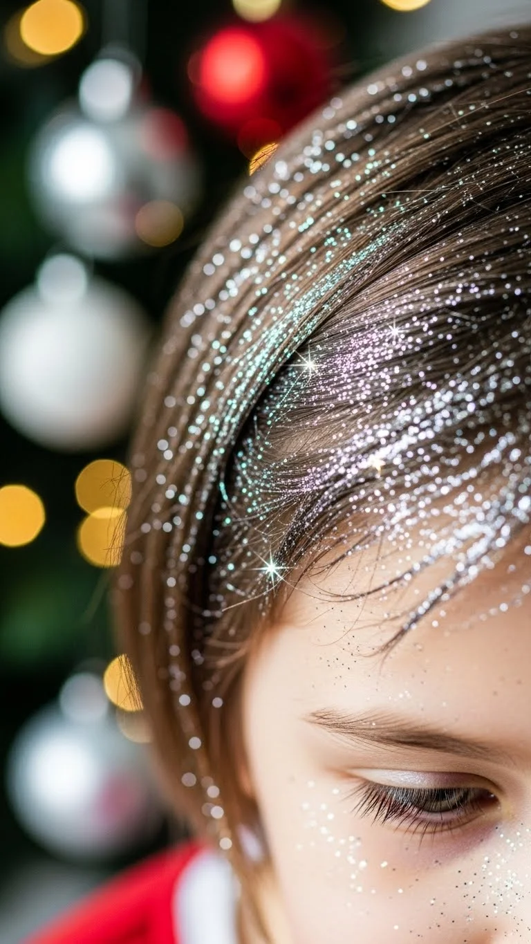 Add glitter to the roots for a subtle but festive touch. Use hair gel to apply fine glitter at the scalp line, concentrating on the crown. Works well with short pixie cuts or bobs. This keeps hair lightweight and playful for parties. DIY tip: Use cosmetic-grade glitter to avoid irritation. Combine with a simple headband or clips for a polished look in under five minutes.