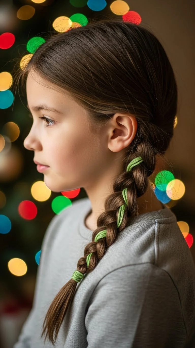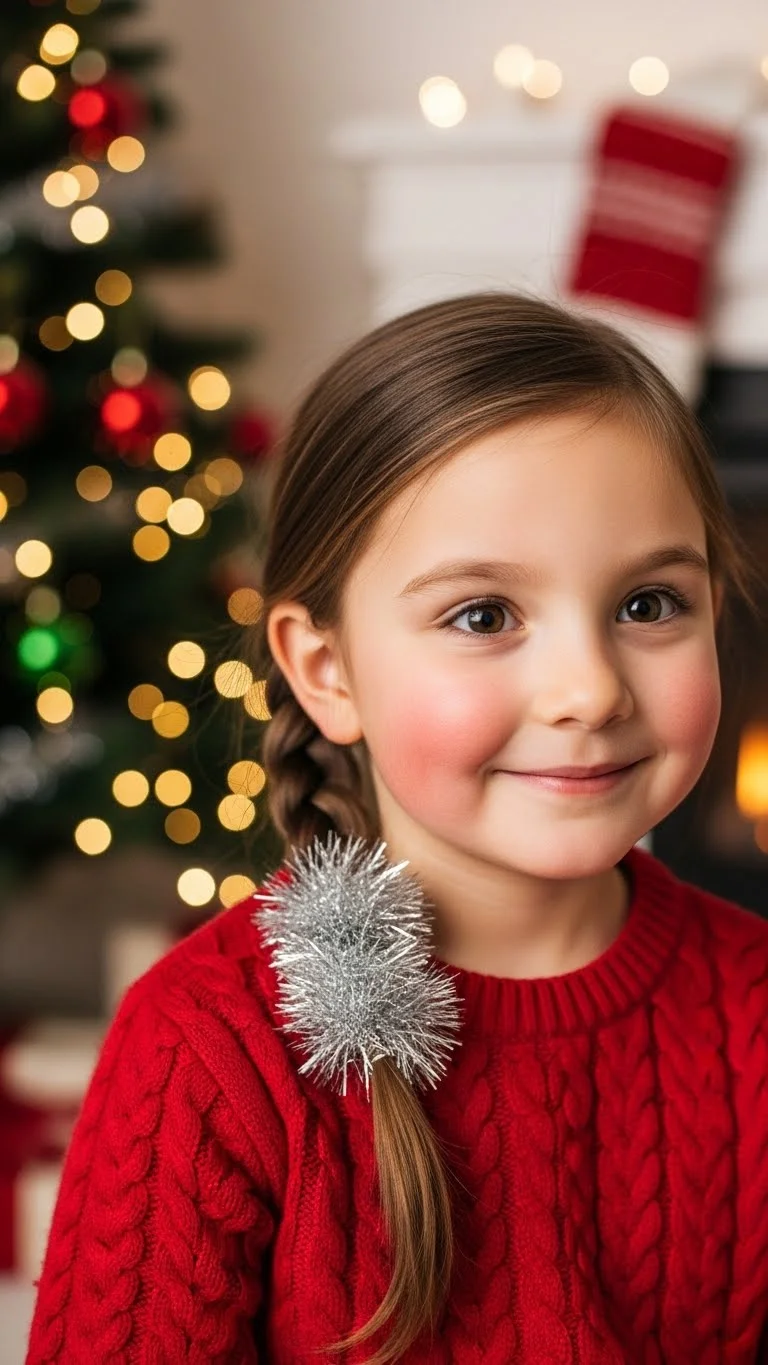 A single braid with a tinsel strand gives a fun sparkle. Choose soft, flexible tinsel so it won’t scratch. Tie it near the top and braid it through. For young kids, use a small amount so it doesn’t feel heavy. If tinsel isn’t available, use metallic ribbon or yarn instead. This works on long or medium hair and takes under five minutes. It’s great for school days because it looks festive without being over-the-top.