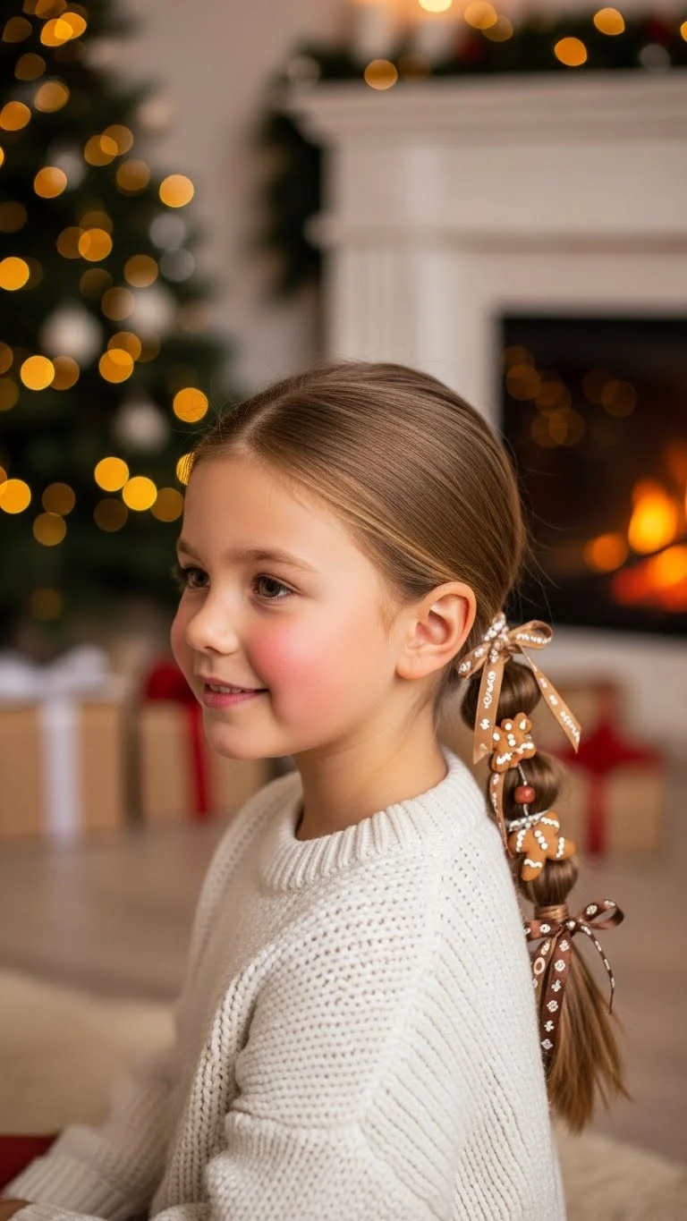 A low pony can look seasonal with warm brown and tan pieces. Wrap the elastic with soft ribbon that matches gingerbread tones. Add a small felt gingerbread shape clipped to the side. Make the gingerbread shape at home with felt scraps. It’s easy, quick, and saves money. For wavy hair, leave the ponytail loose so the texture shows. This style stays tidy for longer events and feels comfortable for kids who don’t like high styles.