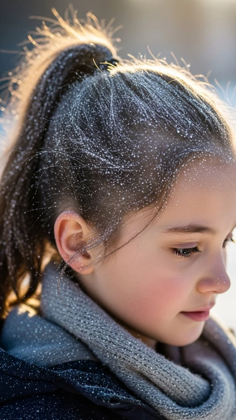 A simple ponytail turns wintery with a dusting of shimmer powder near the ends. Use kid-safe cosmetic shimmer. If you want a totally budget option, mix a tiny bit of cornstarch with silver eyeshadow and tap it gently onto the hair. Keep the shimmer light so it stays soft and doesn’t feel gritty. Add a white ribbon around the elastic for an extra touch. This works for long or medium hair and looks great in photos.