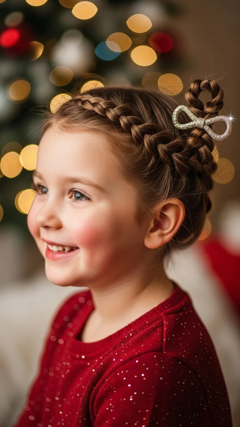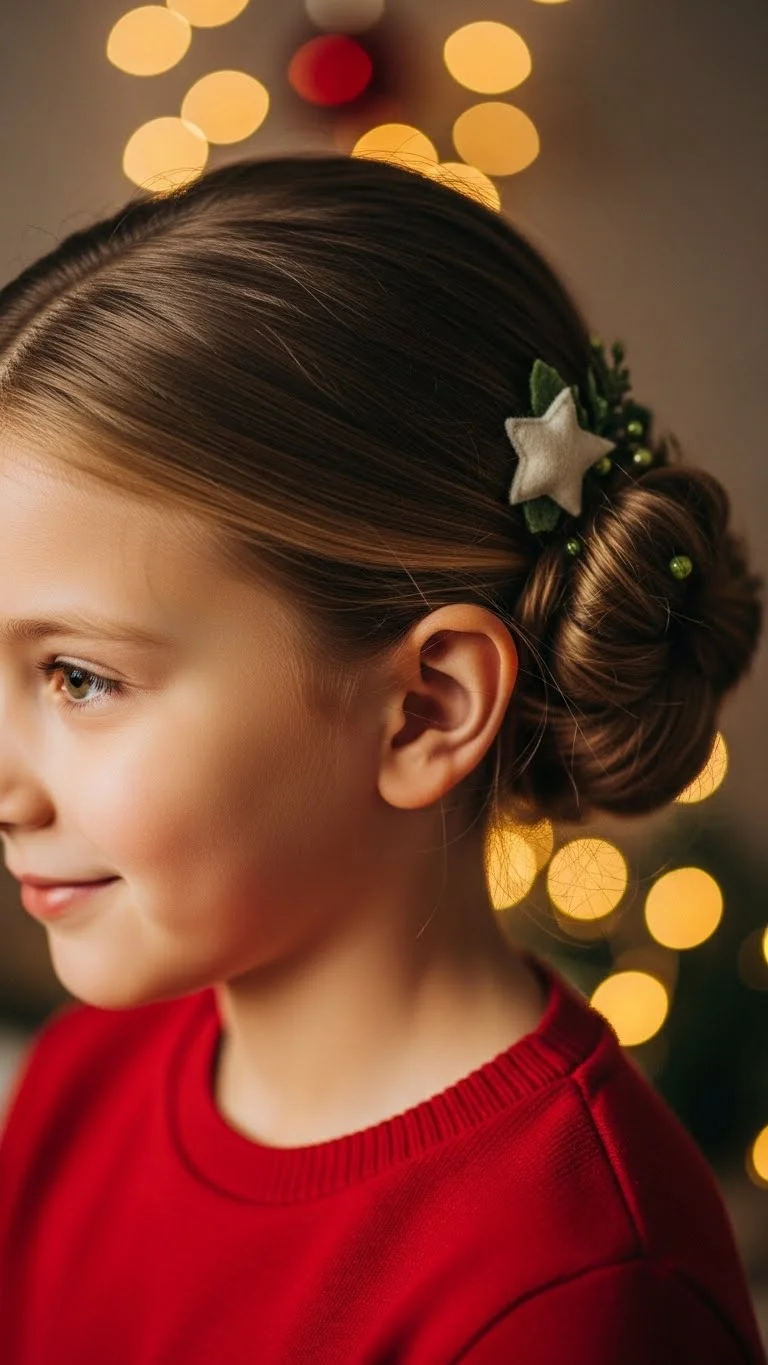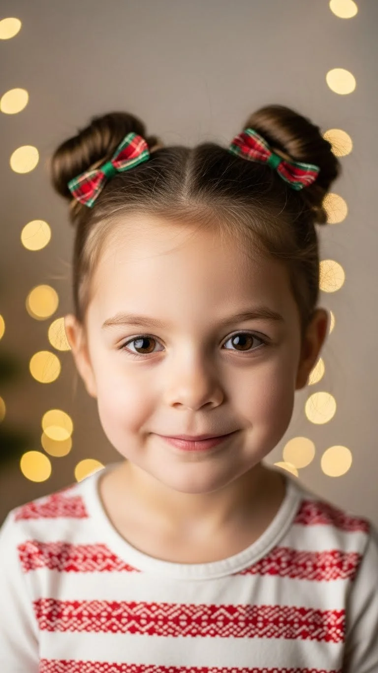 Two small buns create a playful holiday look. Make pigtails, twist, and coil each into a bun. Add tiny bows around each one. You can use leftover gift bows if they’re lightweight. Attach them to clips or barrettes for better hold. For fine hair, use a small amount of water to add grip before twisting.