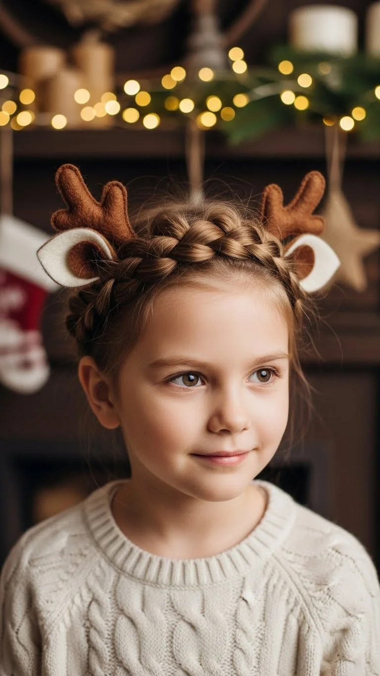 This style turns a simple braided crown into a cute reindeer look. Braid two sections on each side, then wrap them over the head and secure with bobby pins. Add tiny felt antlers near the top. You can cut antlers from leftover felt scraps or even craft foam. Attach them to small clips so they stay steady .For kids with wavy or curly hair, leave a few curls loose around the face. It softens the style and makes the braided crown easier to shape. If mornings are rushed, braid the hair the night before and set it gently with a silk scarf. You’ll only need to clip the antlers on in the morning. This is great for school parties because it stays in place without heavy accessories.