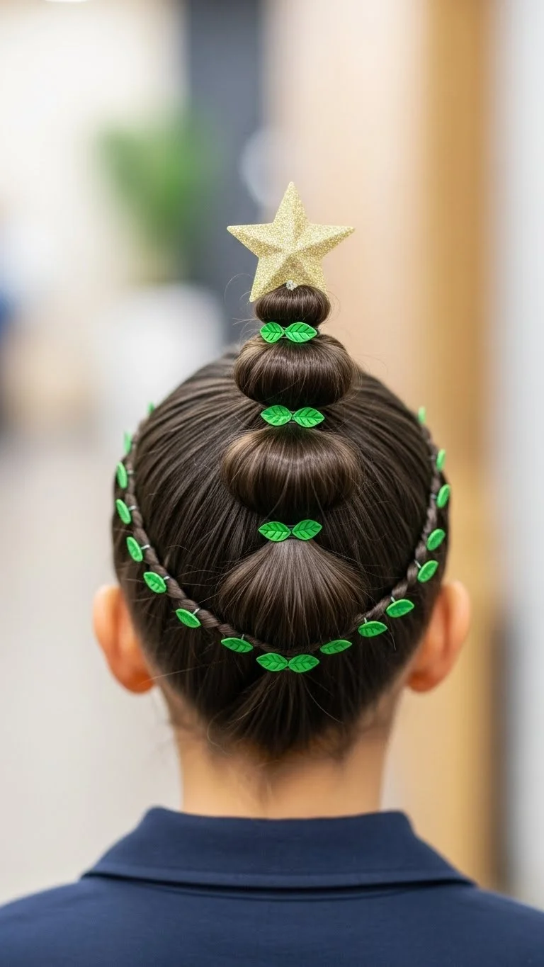 A stacked ponytail forms a cute tree shape. Use three or four elastics down the length of the ponytail. Gently pull each section outward so they form soft “layers.” Attach mini green clips or beads for color. Add a star clip at the top for the finishing touch. If you don’t own themed clips, use green ribbon tied into tiny bows. They cost almost nothing and look charming. For thicker hair, split the ponytail into two sections first to keep everything smooth. This style works for both long and medium hair. It’s quick, comfy, and easy to redo after playtime.