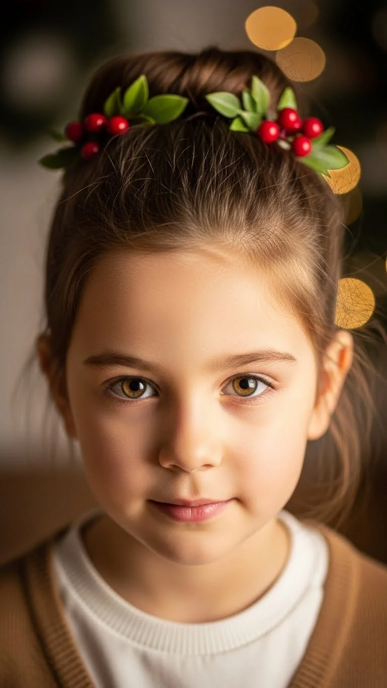 This soft half-up look works well for all hair textures. Gather a small section from the top and secure with an elastic. Add red berry clips and small green leaf accents. If you can’t find berry clips, make them with red beads and glue them to plain bobby pins. It costs very little and lasts through the season. For shorter hair, pin the side sections back instead of creating a full half-up ponytail. Keep the rest of the hair loose and fluffy. Use one or two small curls near the front for a playful touch. This style holds nicely during active events like school programs or outdoor photos.