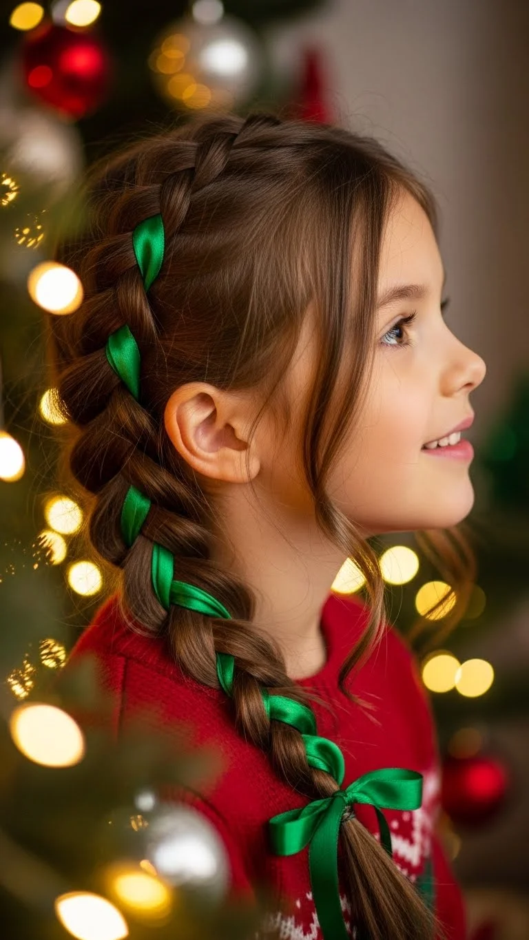 A side braid always looks sweet, and the ribbon gives it a holiday feel. Start the braid loosely so it won’t pull. Weave in green ribbon as you braid. If you only have small leftover ribbon pieces, tie them in at the end instead of weaving. Both options look charming. Add a little water spray before braiding so the hair stays neat. For thick or curly hair, section the top first to make the braid easier to manage.