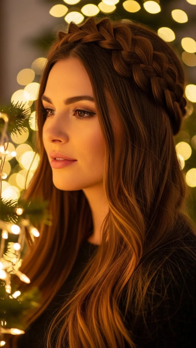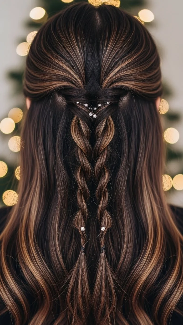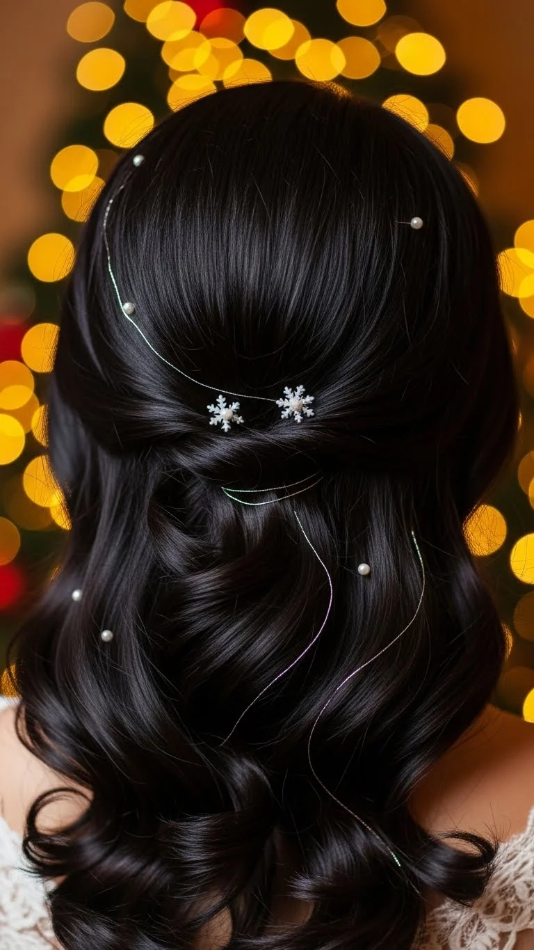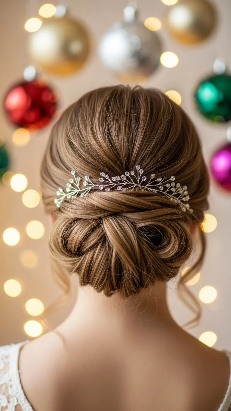 A twisted crown adds a festive vibe without being too formal. Part the hair in the center, twist sections on each side, and pull them back toward the crown. Pin them flat. Let the rest fall naturally. If your hair slips from pins easily, spray the twists before securing them. For sparkle, place a few tiny clips near the twists. This is quick, gentle on the hair, and perfect for a casual Christmas gathering. A simple twist method keeps it budget-friendly and easy to try at home.