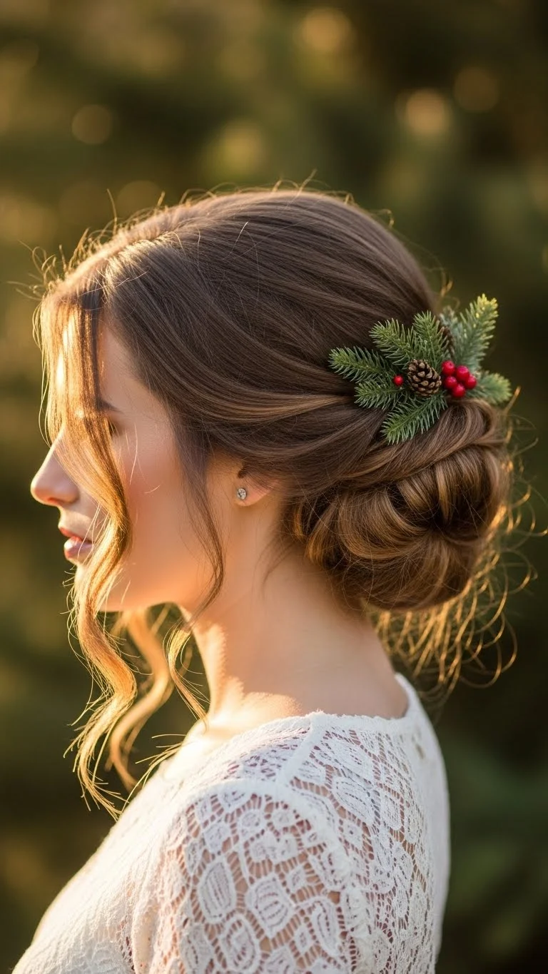 Pull your hair to one side and twist it into a low bun. Pin it loosely. Curl a few strands around your face. Add a bow or decorative pin for a holiday feel. This style sits comfortably and pairs well with off-shoulder outfits. If your hair is heavy, use large pins for support. You can complete this in minutes with items you already have.