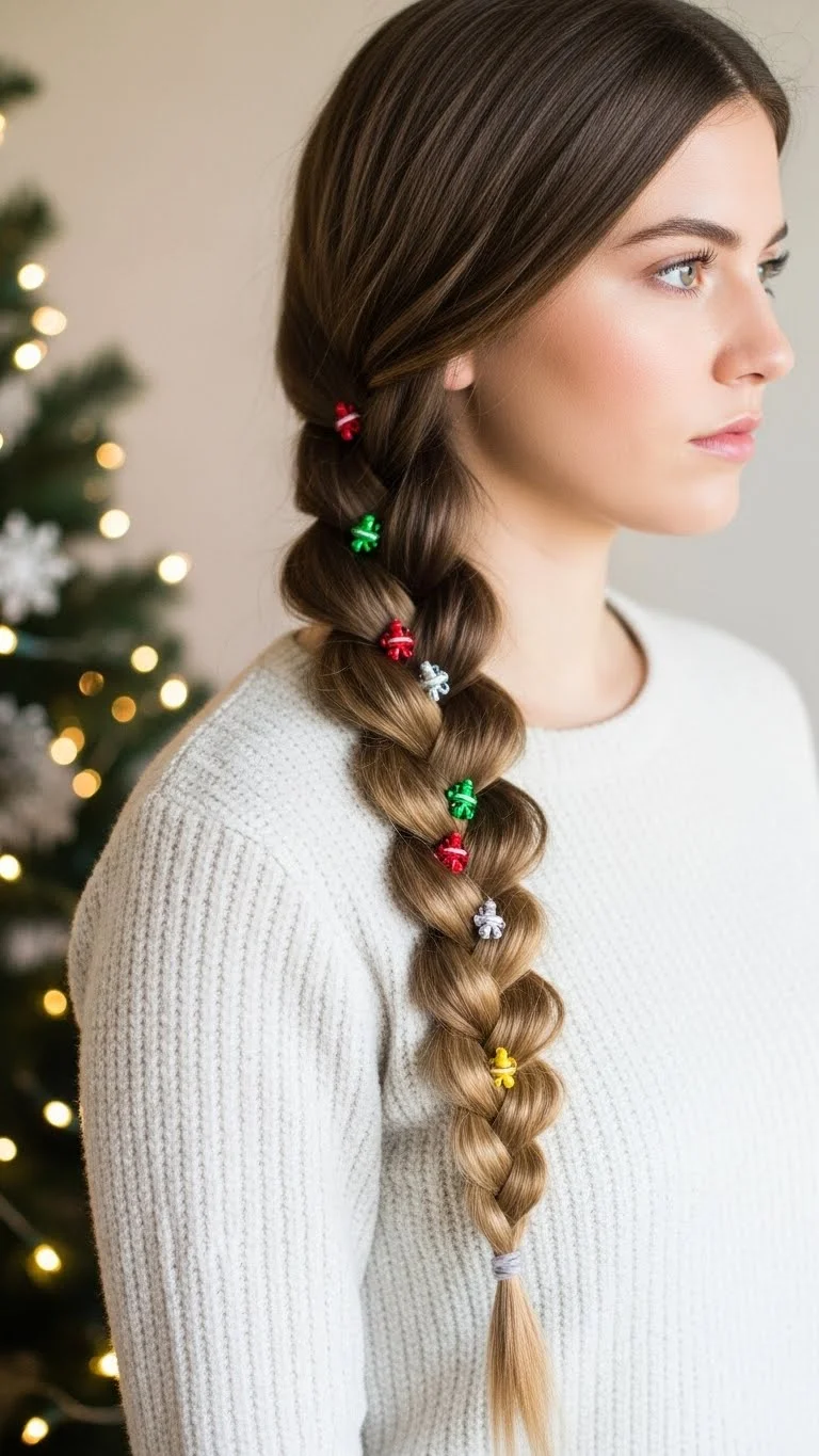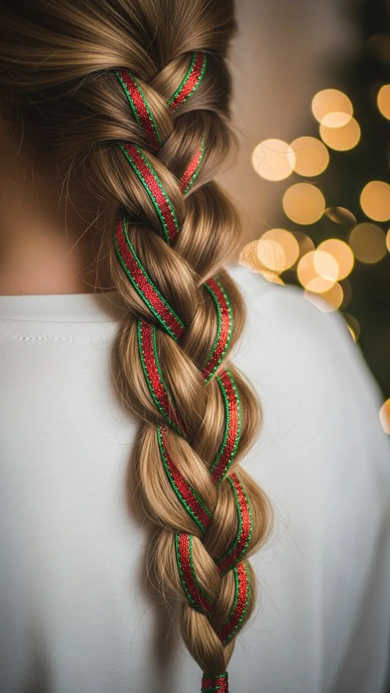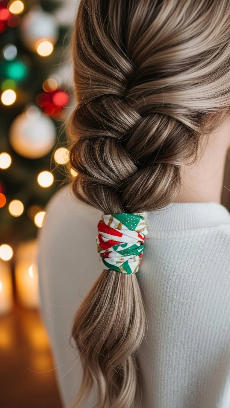 Start with a low ponytail, then braid it loosely. Pull on the braid slightly to make it look fuller. Wrap a ribbon around the base for color. If your hair is long, secure the end with a clear band. This style looks relaxed and works for casual events. Add small clips or tiny bells for a holiday twist. You can do this in minutes and with inexpensive accessories. It also works well on day-old hair.