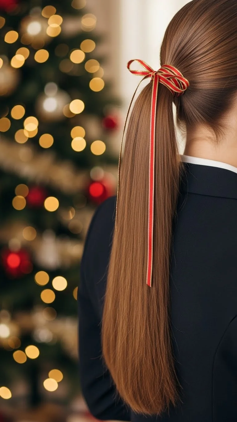 A low ponytail feels simple yet elegant for holiday plans. Brush your hair until smooth, then tie it close to the nape with a soft elastic. Wrap a small piece of hair around the band to hide it. You can iron the hair for a glass-like finish if you want a sharper look. Add a ribbon that matches your outfit for a subtle accessory. If you want more fullness, tease the ponytail gently in the middle. A drop of serum keeps the surface smooth. This works well if you’re short on time or want something that stays put all night.