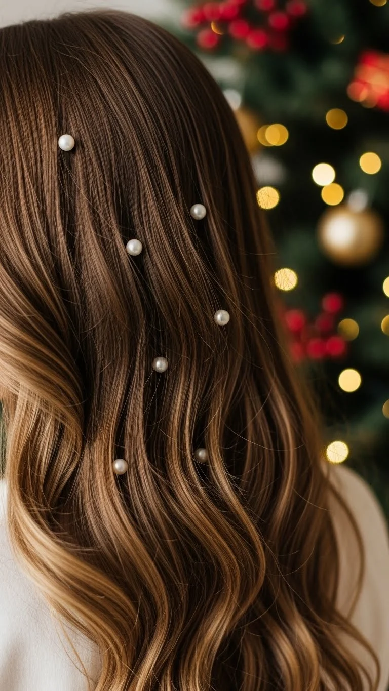 Pearl pins instantly make simple waves feel special. Curl your hair loosely, then place small pearl pins throughout the top layer. Keep them spaced out for a soft effect. These pins are inexpensive and available at craft stores. You can mix small and medium sizes for added interest. This style looks sweet for both casual and formal Christmas plans. It also photographs beautifully without much effort.