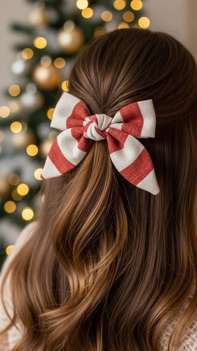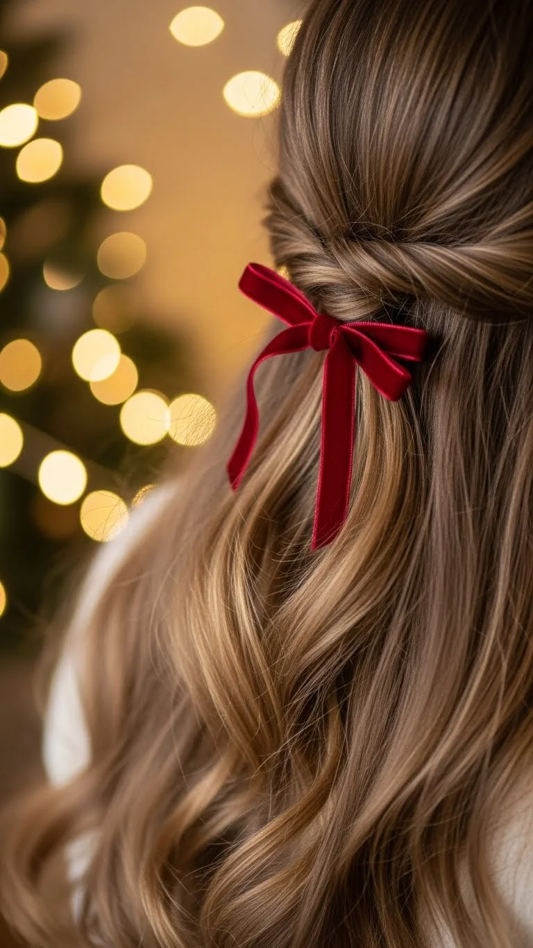 A half-up look gives you the best of both worlds. Gather the top section, pull it back gently, and secure it with a soft bow clip. Choose velvet or satin for a seasonal touch. Curl the ends for movement. If you want more hold, twist the section before clipping it. Use small pins to control flyaways. This style works even if your hair is thick, since you can adjust the amount you pull up. A drugstore bow or ribbon keeps the cost low and still looks pretty.