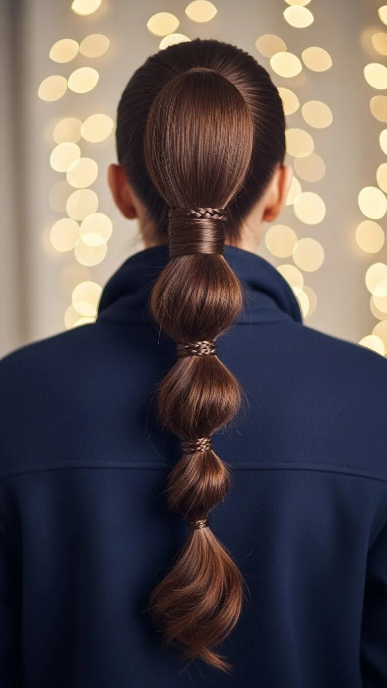 A bubble braid is fun and easy. Start with a ponytail and place small elastics down the length. Pull each section gently to create the bubbles. Add red or gold elastics for Christmas charm. This works well on thick or long hair. You can do it in under five minutes. It stays secure and looks great with sweaters or festive outfits. Cheap elastic packs make this very budget-friendly.