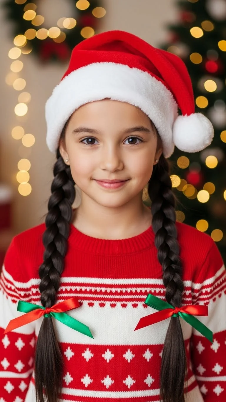 Braided pigtails add a cute seasonal touch. Part the hair evenly and braid each side loosely. Tie the ends with festive ribbons. Pull out a few strands for softness. This style is budget-friendly and comfortable. It stays secure even during outdoor events or family activities. If you want a fuller look, tug gently on each braid. It works for all hair textures and takes only minutes.