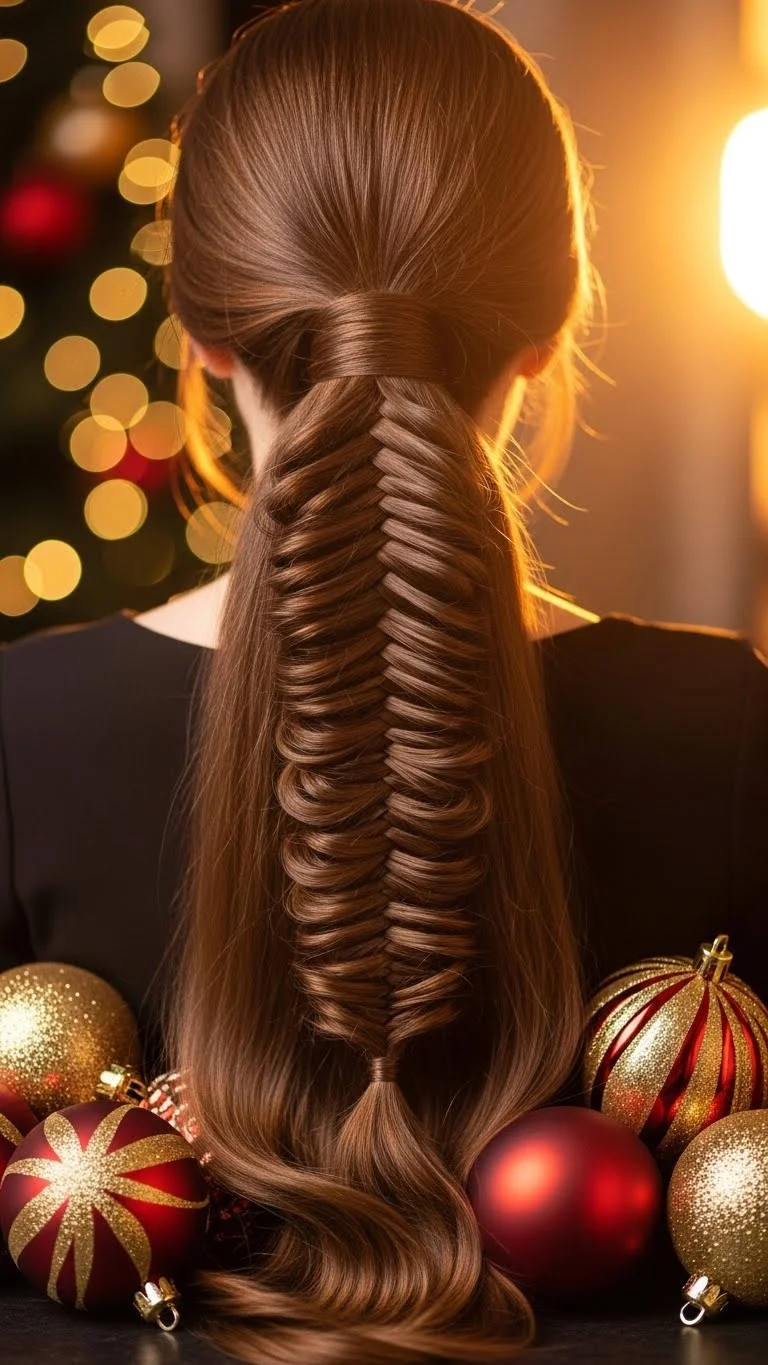 A fishtail braid looks detailed but doesn’t require much skill. Split the hair into two sections and alternate small pieces from each side. Keep it loose for a soft finish. Add glittery pins down the braid for a Christmas feel. If your hair is very long, braid only halfway and leave the rest flowing. This braid takes a little time but is simple once you get the hang of it. You can practice a few times before your event.
