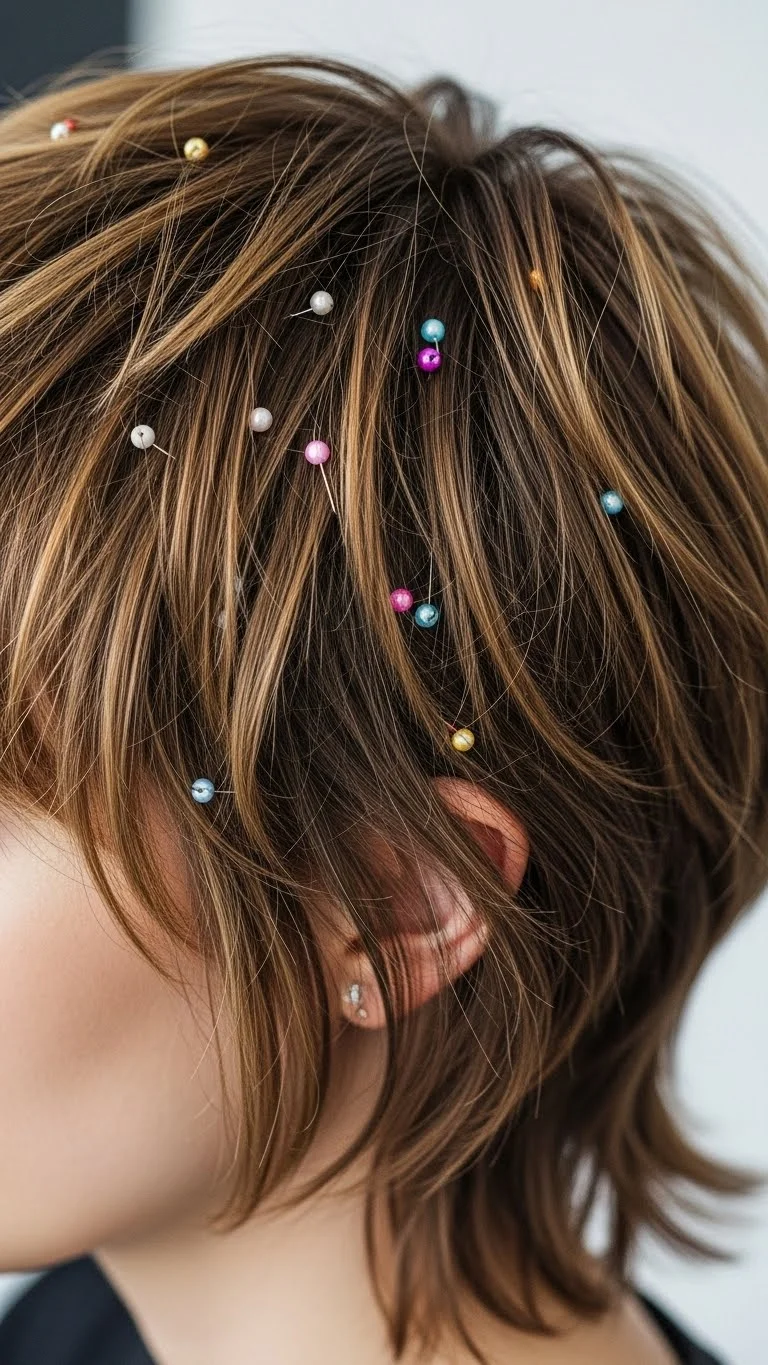 A short shag has natural movement, and beaded pins can add sparkle without heavy styling. Place pins in the mid-layers to keep things open. Pick small beads so the layers don’t slump. Make your own by gluing beads onto plain pins from a discount pack. Add quick volume by blow-drying with your head flipped over. Scrunch lightly while warm. This look suits any outfit and works for both casual and dressy holiday plans.