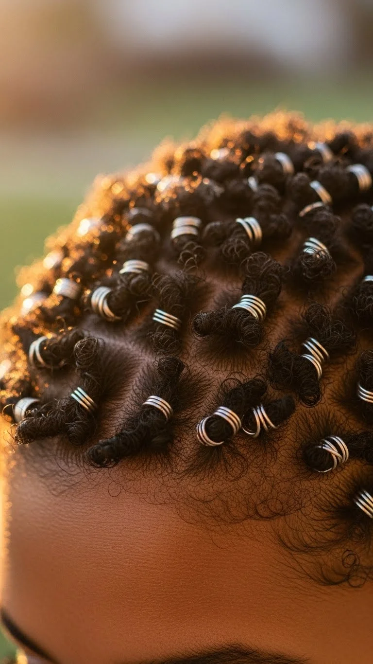 Metallic rings can brighten short coils with almost no effort. Open the ring slightly, slip it around a coil, and pinch it shut. Place two or three near your face for soft sparkle. You can buy rings in bulk for a small price. Mix silver and gold for variety. Keep coils moisturized with a small amount of cream or leave-in conditioner. Refresh individual coils by twirling them around your finger. This style holds up for hours and photographs well.