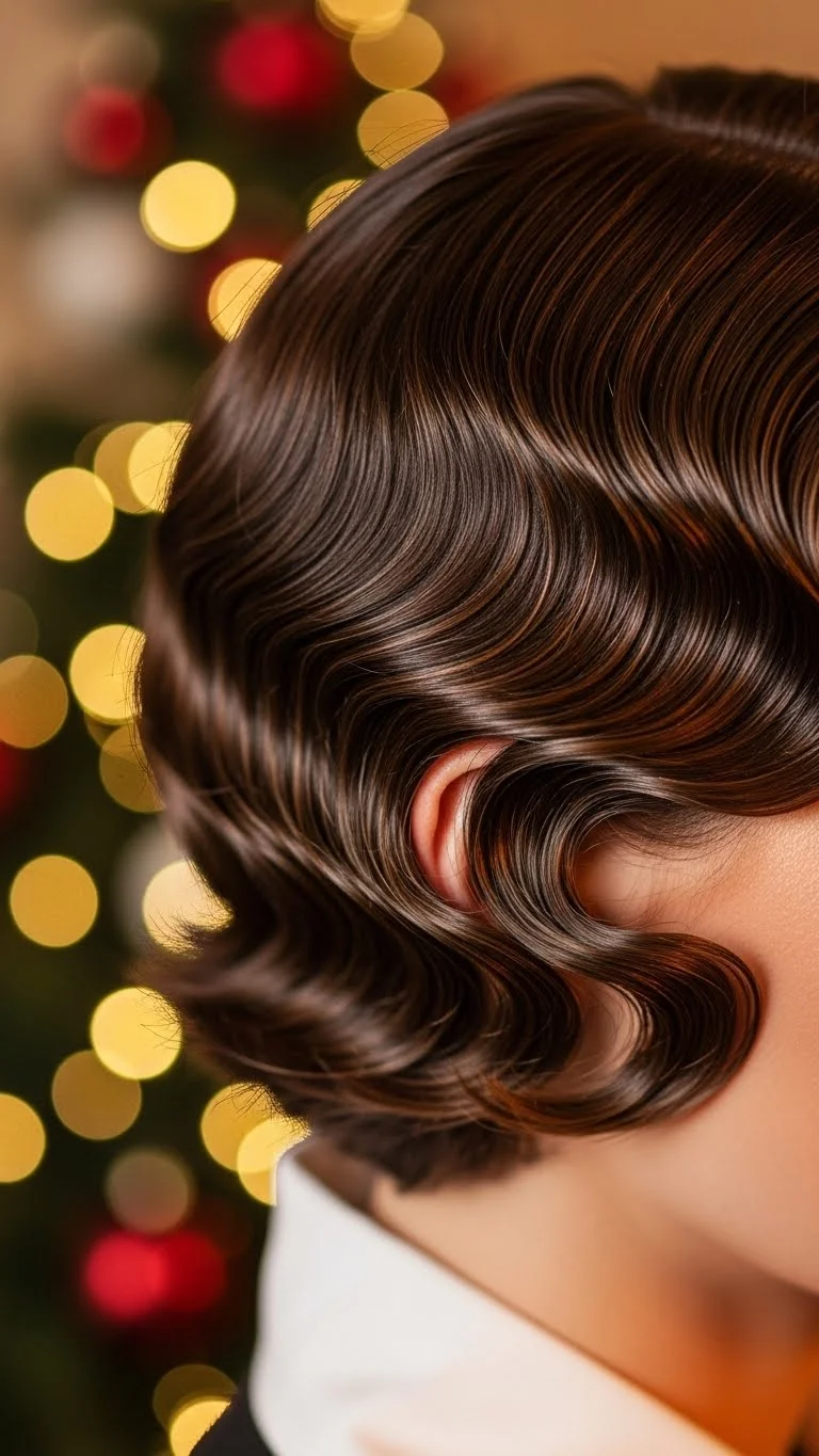 Finger waves bring a classic feel to holiday photos. Use gel to mold soft S-shapes along the front. You don’t need expensive clips. Use regular metal clips from the dollar store to hold each bend in place until dry. Keep the waves near your face and let the rest of your hair stay simple. If your waves lose shape later, mist lightly with water and re-press the curves. This style looks elegant with minimal accessories.