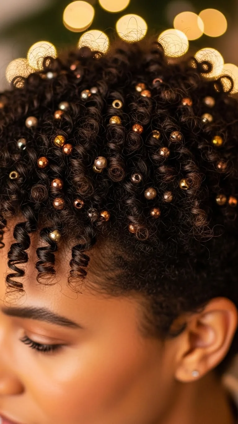 A curly crop already has lively shape, and beads can make it feel festive. Pick lightweight beads so your curls stay bouncy. Slide them onto tiny hair pins and nestle them near the roots. A few placed at random gives a natural sparkle. You can find bead assortments at craft stores for a low price. Choose colors that work with your outfit or stick to simple clear beads for a frosty glow. Avoid heavy pieces so your curls don’t stretch. Refresh curls with a water spray bottle before styling. Scrunch gently to form soft clumps. Add a tiny bit of curl cream to keep frizz low. This look photographs well in warm indoor lighting and still holds up outdoors.