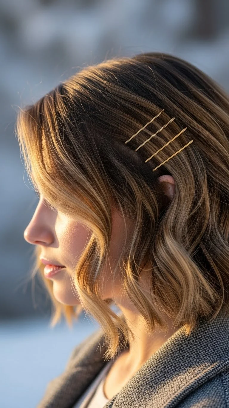 A wavy bob becomes instantly festive with gold pins stacked on one side. Create loose bends using a curling wand or by twisting damp hair and letting it dry. Keep the waves soft so the pins stand out. Affordable gold pins are easy to find at dollar stores or online. If your hair is fine, roughen the inside of the pin with a nail file for better grip. Angle the pins in a neat row or form a tiny triangle. This adds shape without effort. Mist your waves lightly to keep things airy. If a piece falls flat later, twist it around your finger for a quick fix.