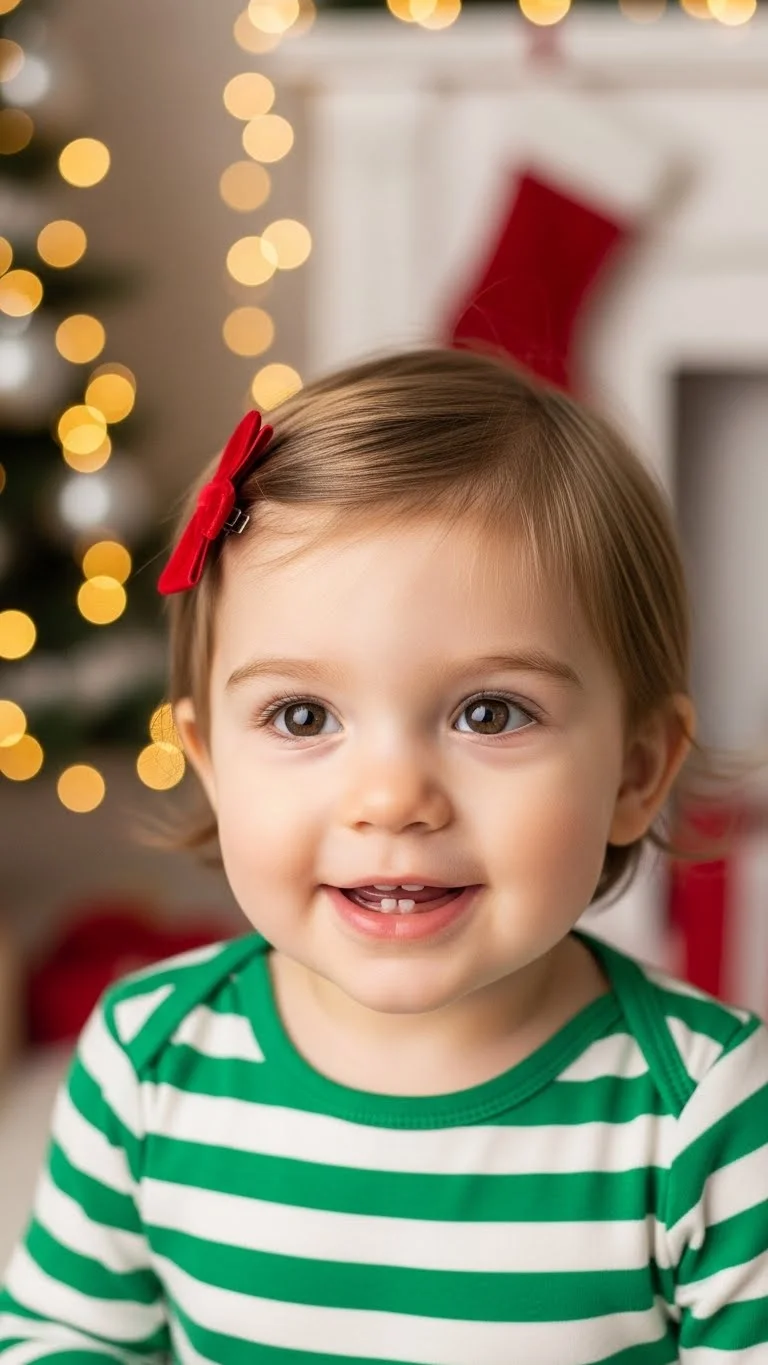 For short hair, side-swept bangs work well. Brush bangs gently to one side. Secure with a small clip if needed. This keeps hair out of the eyes. Parents like how quick it is. Use everyday clips in holiday colors.