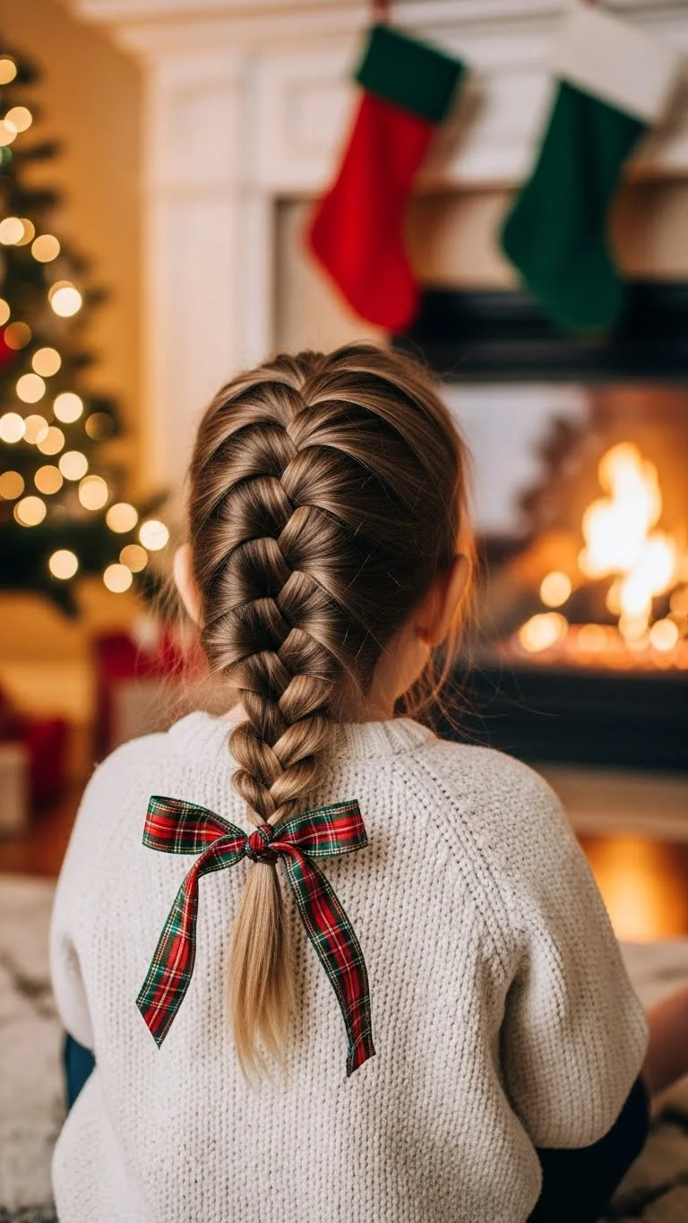 A side braid feels calm and charming. Brush hair gently to one side and braid loosely near the ear. Secure with a soft elastic. Add a small bow for Christmas style. This works well for medium hair lengths. If the braid loosens, it still looks cute. Parents like how forgiving it is. You can stop the braid halfway for shorter hair. It keeps hair away during meals. Gift ribbon makes an easy budget bow. This style suits family visits and daycare parties.