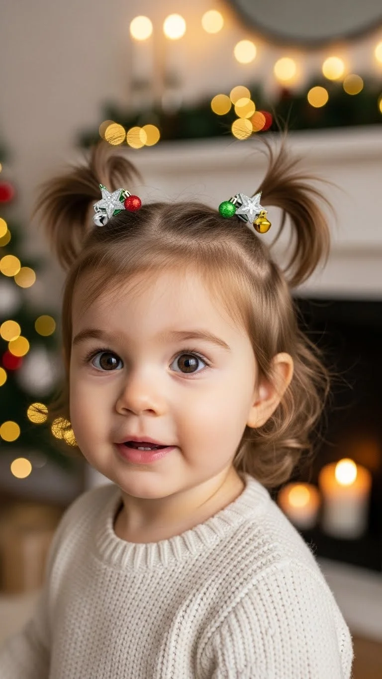 High ponytails add cheerful energy. Place them high but keep them loose. Decorate with holiday clips. Parents like how fun it looks. Mix clips you already own to save money. This style suits active toddlers.