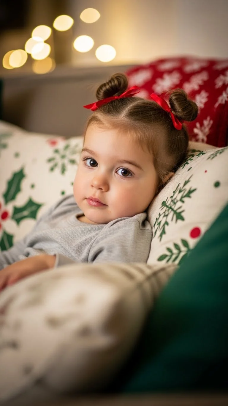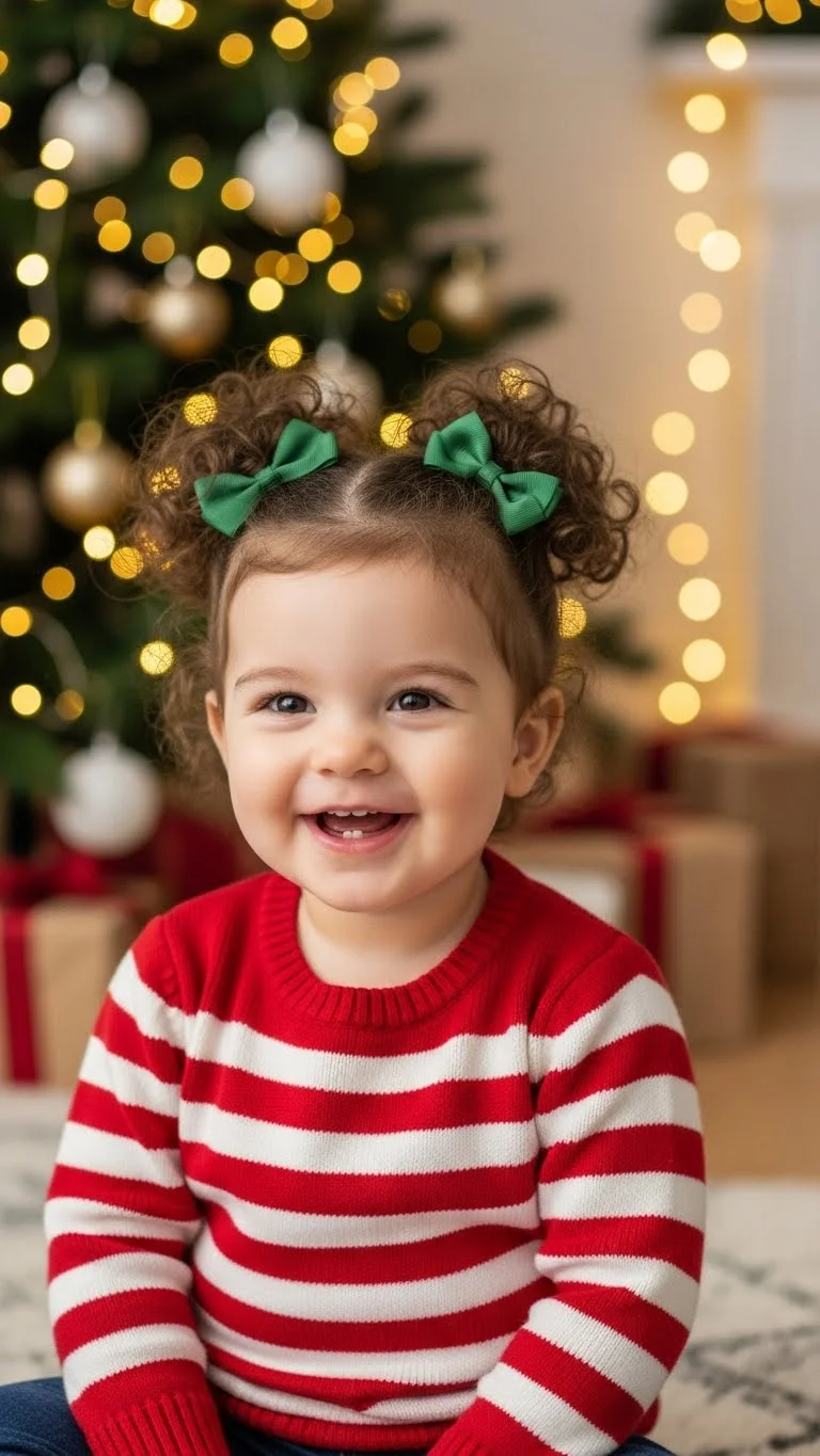 Mini space buns add playful fun. Part the hair down the middle. Twist each side into a small bun on top of the head. Secure gently with elastics. Wrap thin ribbon around each bun for a holiday detail. This style works best on short to medium hair. It keeps hair off the face during active play. Parents enjoy how well it stays put. Even if pieces slip out, it still looks sweet. Water helps smooth curls without products.