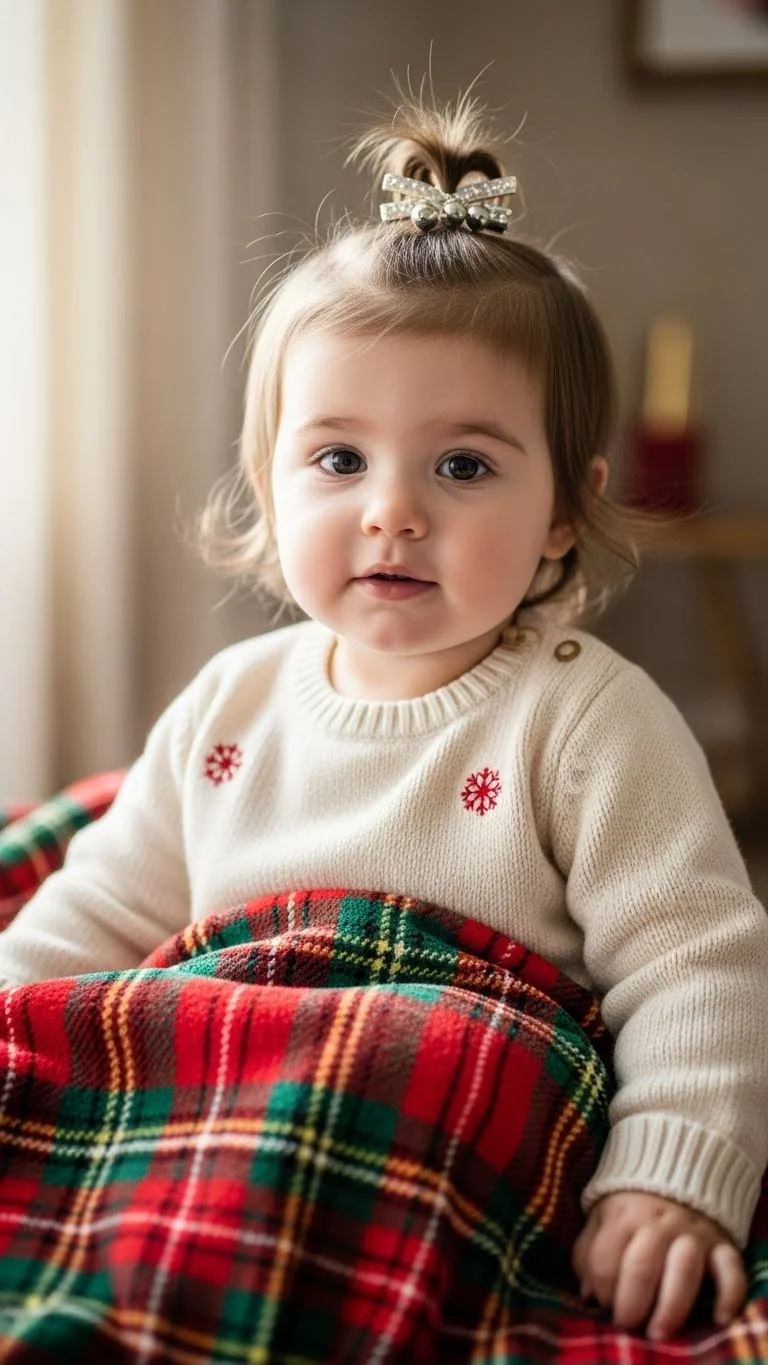 A tiny top knot works well for short hair. Gather the top section and twist into a small bun. Secure with a soft elastic or clip. Add a festive clip for charm. This keeps hair off the face. Parents like how fast it is. Even a small knot looks cute. Use clips you already own to save money.