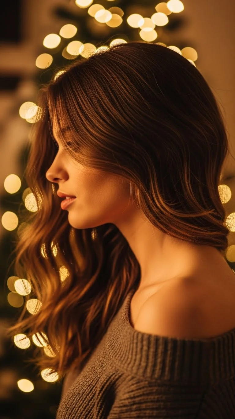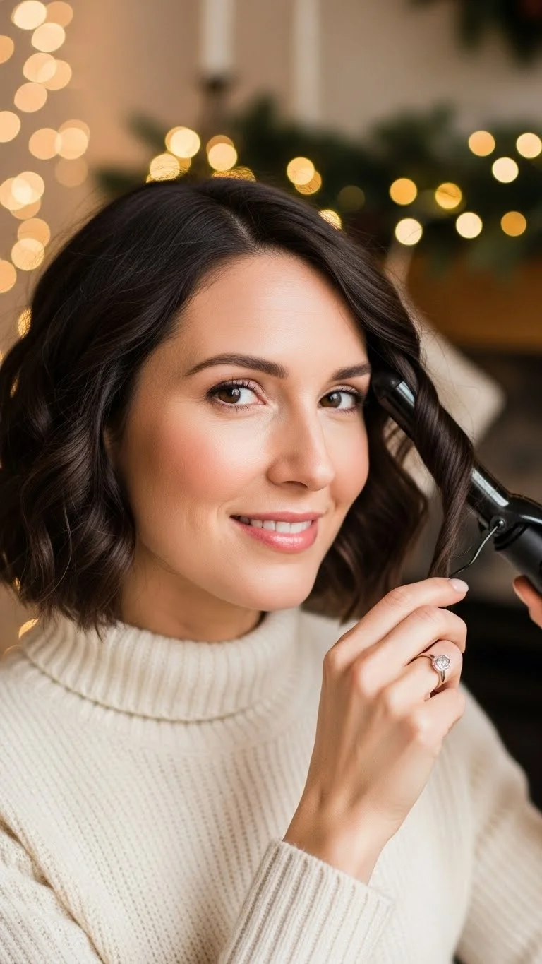 Glossy waves feel classic for holiday gatherings. Curl wide sections away from your face. Brush them out for a soft flow. Add a pea-size amount of serum for sheen. Not too much or it weighs down. If your hair struggles to hold curl, use flexible hairspray first. This style suits portraits well because the waves catch light nicely. You can dress it up with a subtle barrette.