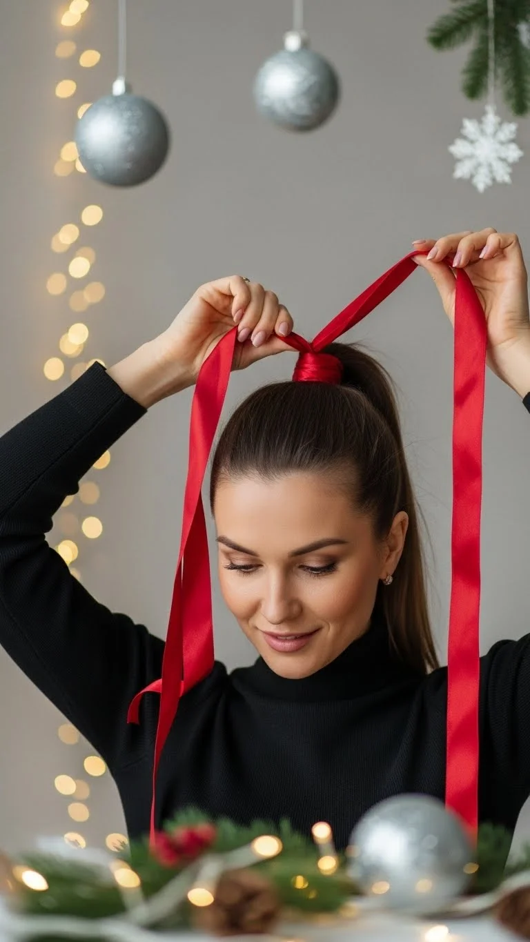 Create a small bow using your own hair. Make a half ponytail, but don’t pull it through all the way. Split the loop into two bow sides. Wrap a small piece of hair around the center. It looks cute and festive. If it’s difficult, add a real ribbon bow instead.